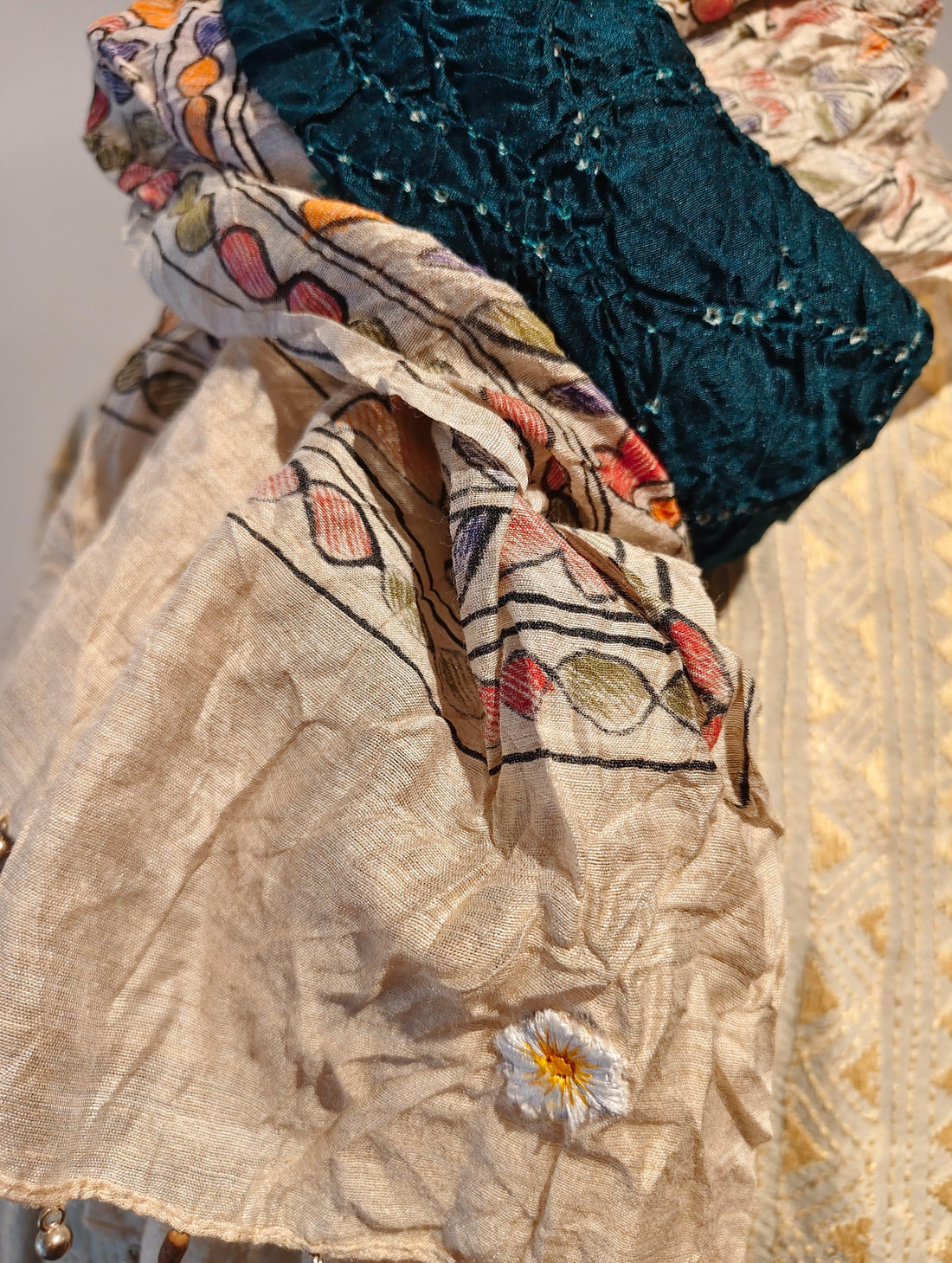 Beige silk becomes a canvas for fine Kantha embroidery in this dupatta, where each stitch...
