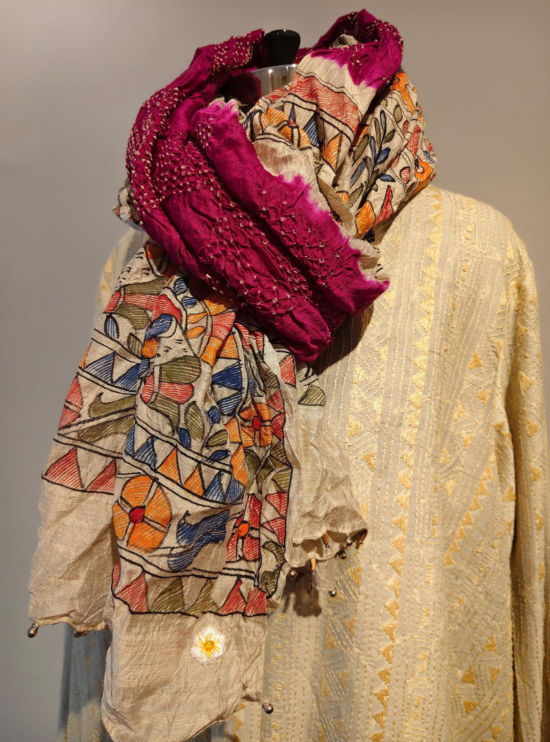Hand-tied Rai Bandhani motifs flow into Kalamkari illustration across this dupatta, blending two distinct traditions...
