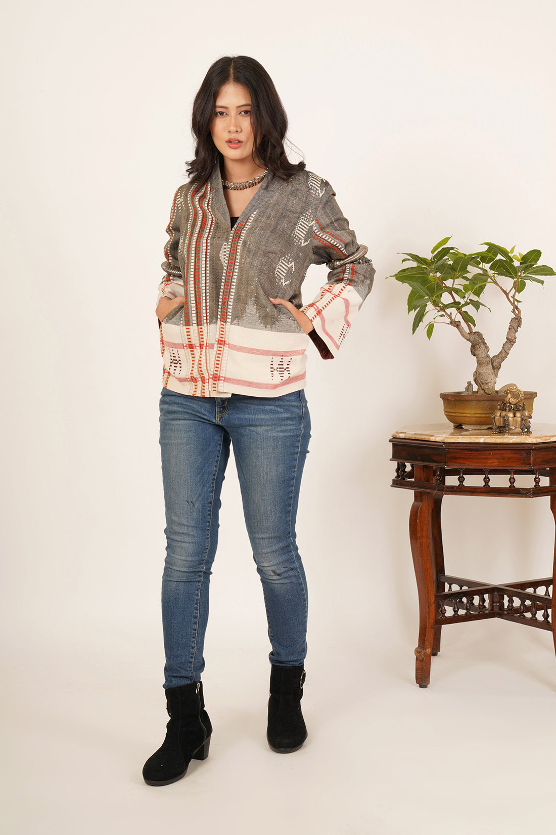 Grey Kotpad jacket, medium length and full-sleeved. Subtle weaving, quiet elegance for modern wear.