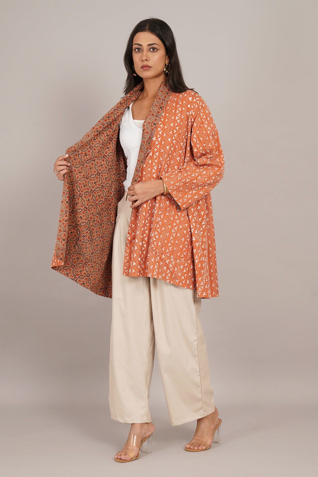 A Kantha Ajrak cape that merges printed symmetry with hand stitching. Ajrak cotton panels feature...