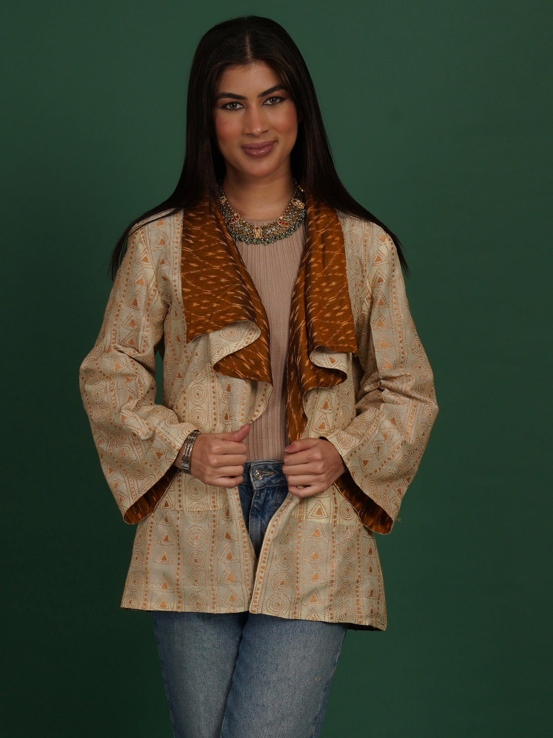 A Kantha Ikat cotton cape that balances pattern and texture. Ikat panels show softened motifs...