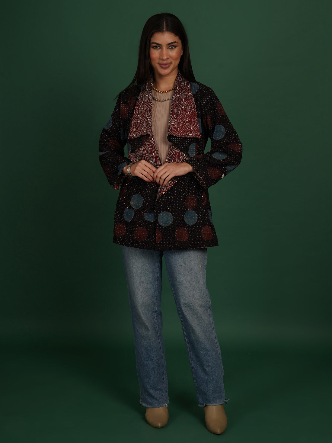 A Kantha Ajrak cape that merges printed symmetry with hand stitching. Ajrak cotton panels feature...