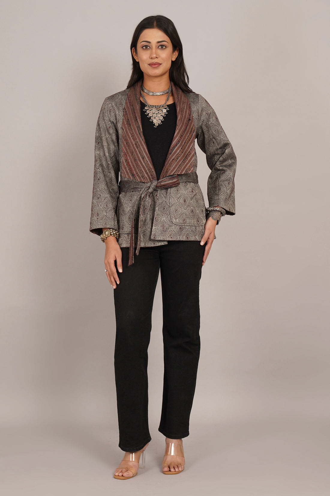 Grey Kantha Brown Wollen Short Jacket