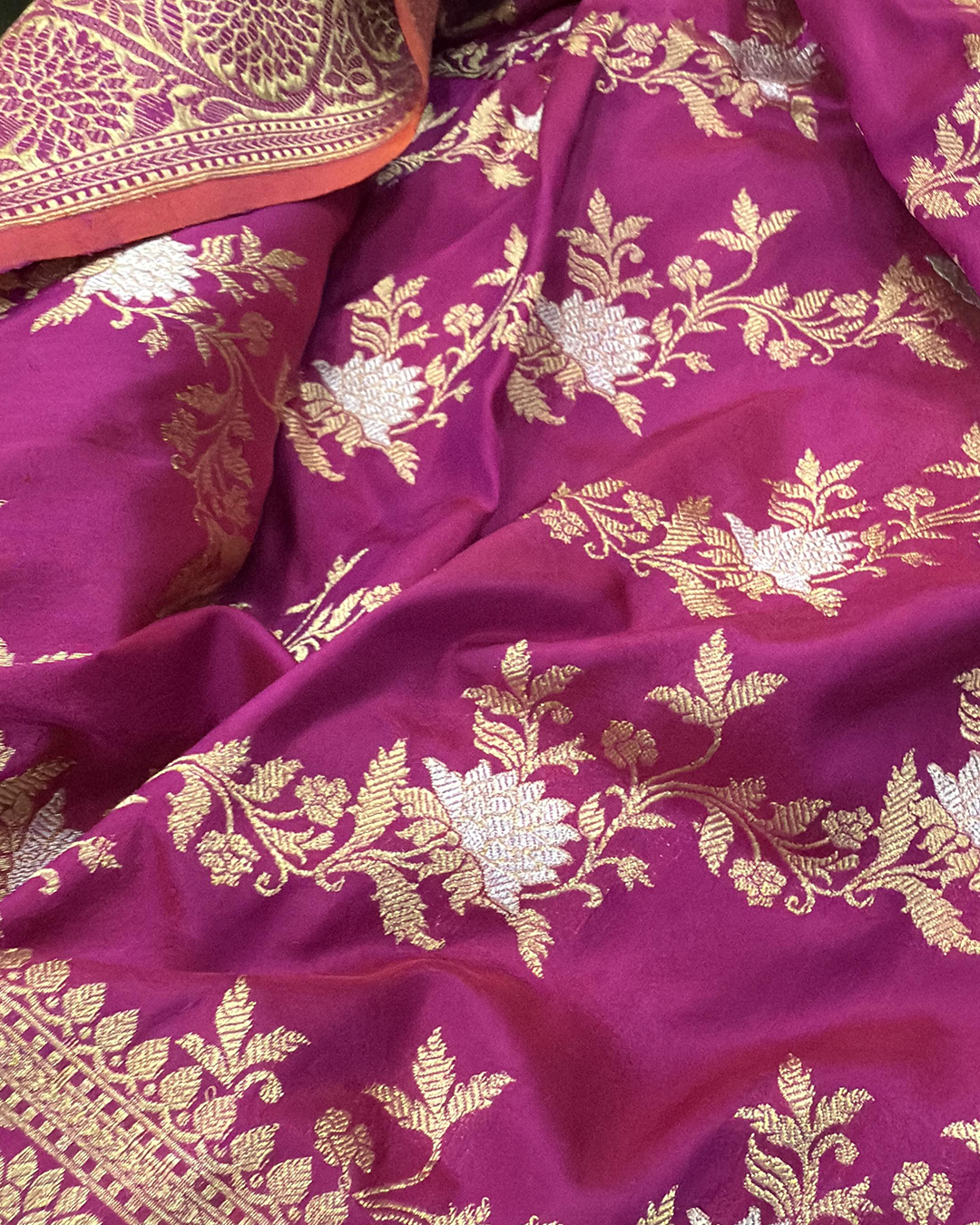Few fabrics in India carry the weight of legacy that Banarasi silk does. Woven in the holy city of Varanasi, this textile is a masterpiece of opulence. Varanasiâs ancient looms have produced these magnificent fabrics for over 1,000 years. The craft reached unprecedented heights during Mughal rule, when Persian motifs merged with Indian techniques, giving rise to signature kalga-bel patterns, jaals, floral sprays, and designs inspired by Mughal paintings with intricately woven zari borders. Banarasâ position along the Ganges enriched its weaving communities with a steady supply of fine silk and a cosmopolitan blend of cultural influences.