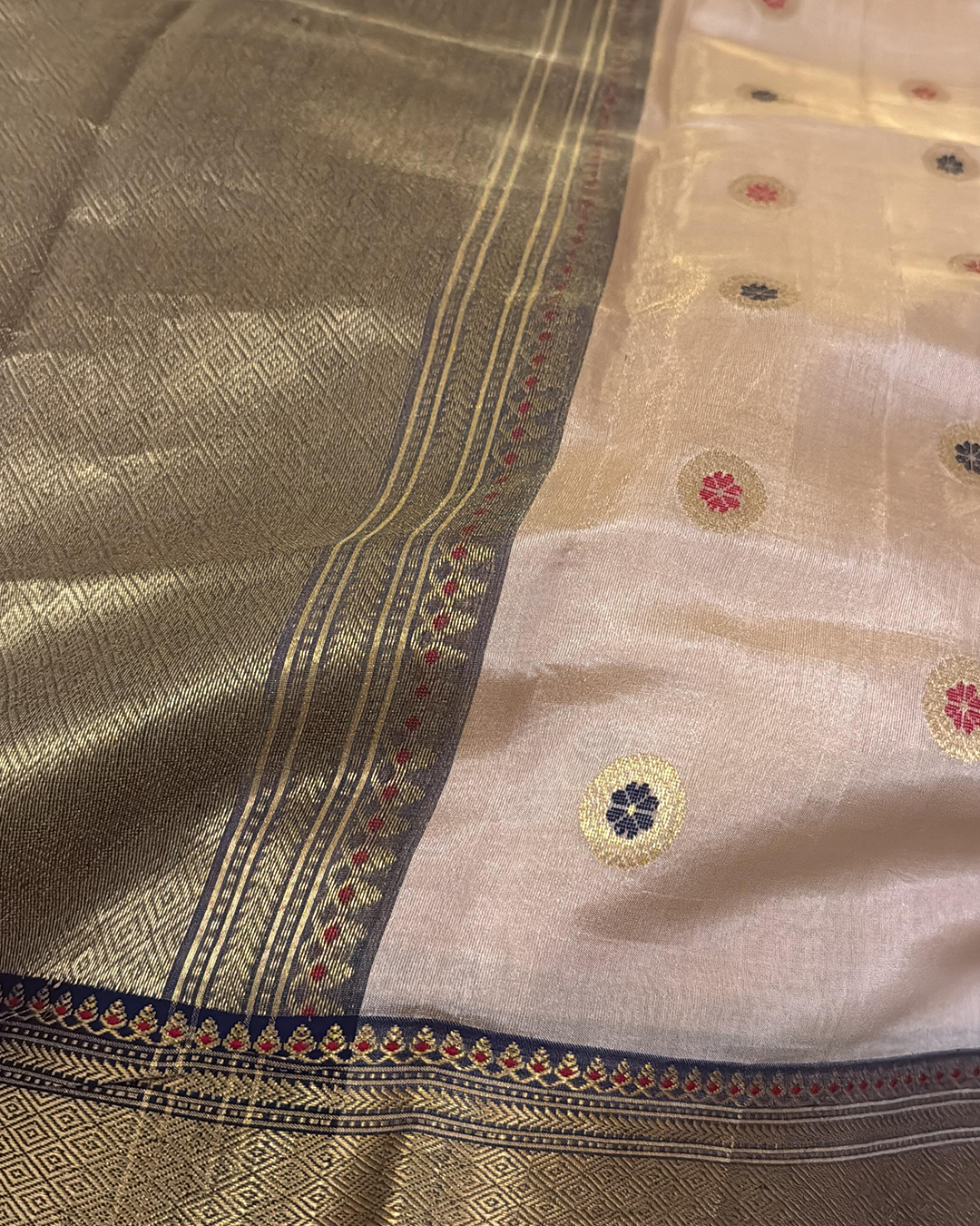 The weaving process employs traditional handlooms. Three-shuttle techniques integrate cotton warp, silk weft, and zari patterns simultaneously. Master weavers calculate precise tension and beat to achieve Chanderiâs signature transparency while maintaining strength. Traditional motifs include coins, flowers, peacocks, and geometric patterns, often inspired by Mughal architectural elements. The famous âtissueâ variety achieves near transparency while incorporating gold and silver threads that create subtle metallic shimmer.
