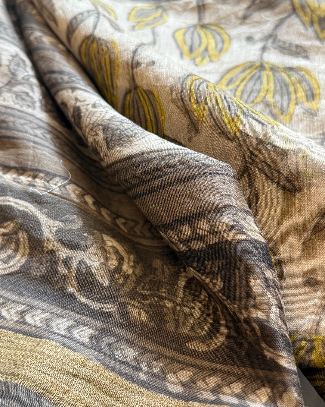 The collection process follows ancient sustainable practices: gatherers wait for moths to emerge naturally before collecting empty cocoons, ensuring forest balance. The irregular cocoons yield silk with natural slubs and texture variations that create Tussarâs characteristic rustic elegance. Hand-reeling preserves these natural irregularities, while the silkâs porous structure readily absorbs natural dyes, creating rich, deep colours with subtle variations. Sarees often feature tribal motifs, temple borders, and natural dyes, making them deeply connected to local culture and ecology.