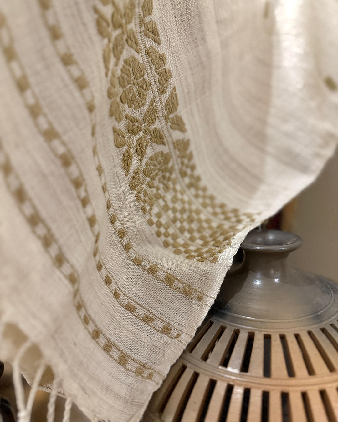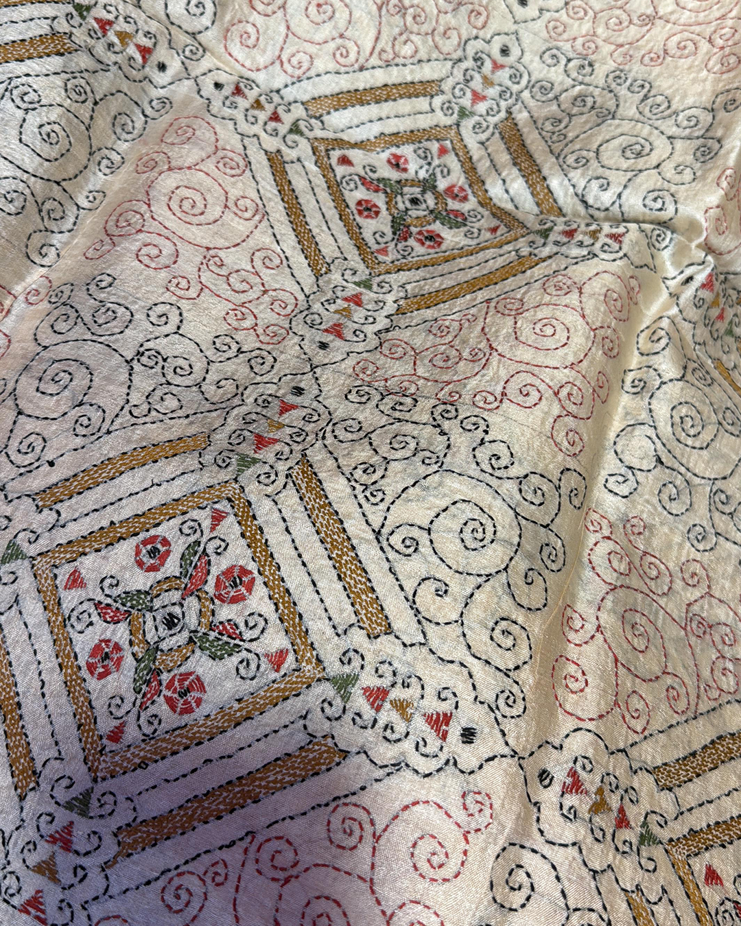 Kanthaâs earliest references are found in the 16th century, with mentions in literature and folklore highlighting the tradition of womenâs artistry passed through generations. Each stitch in Kantha is minimalistic, yet when repeated it builds a strikingly detailed surfaceâmaking it more than just embroidery, but storytelling in thread.