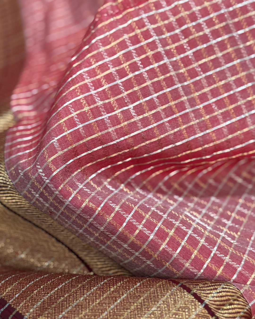This elegant craft achieved its golden age under Queen Ahilyabai Holkar in the 18th century, who invited master weavers from various regions to establish workshops producing textiles worthy of royal courts. The combination of cotton and silk creates fabrics with Maheshwariâs distinctive character: substantial yet refined. Maheshwari sarees are known for their reversible borders and geometric motifs, often drawing inspiration from the townâs architectureâtemple spires, palace walls, and river patterns. Originally, classic Maheshwari saris were woven only in pure cotton, 9 yards long, with pallus at both endsâso when they frayed, the saree could be reversed and worn. One distinctive feature is the âchattaiâ (mat) pattern.