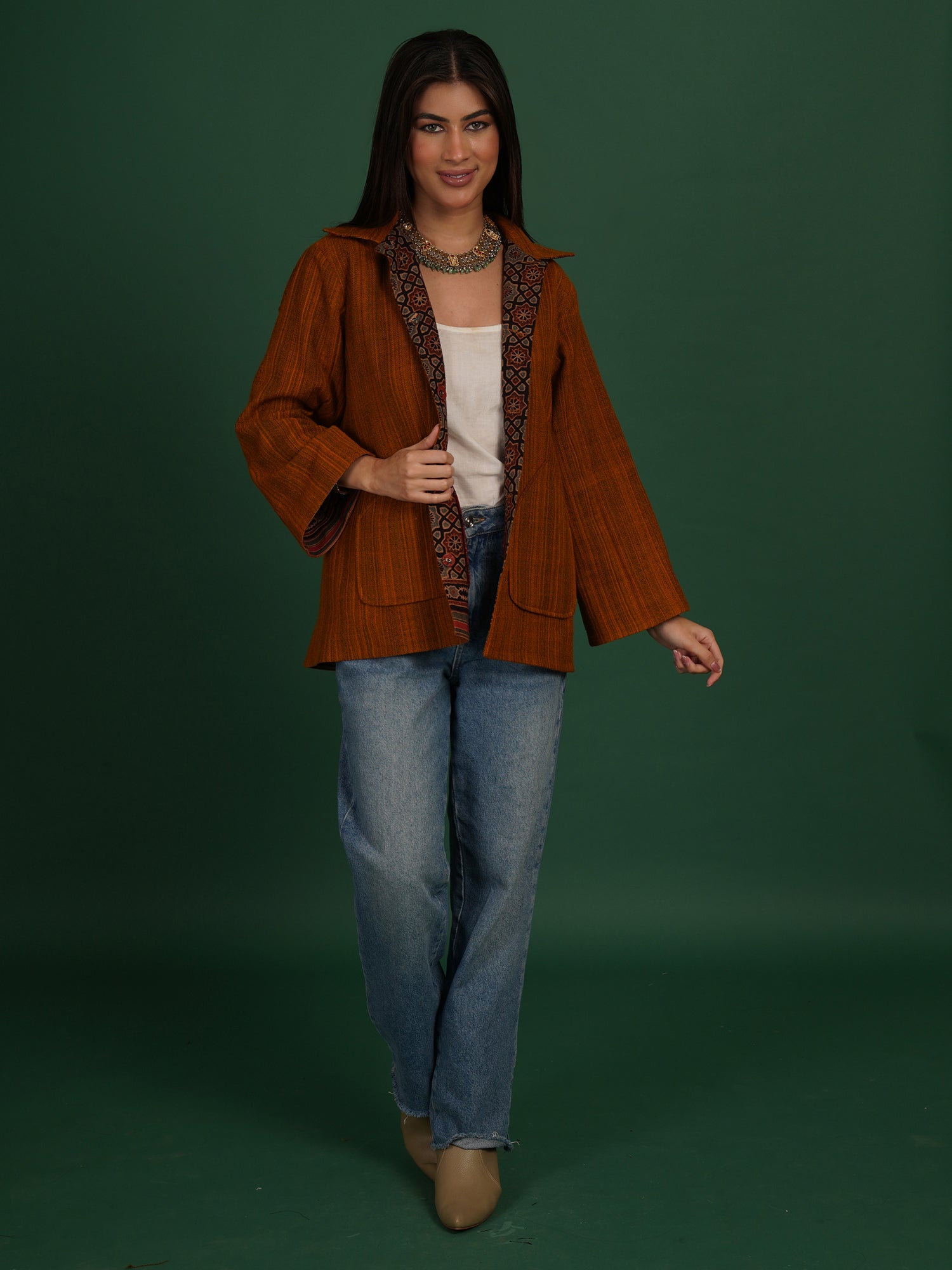 A woollen Ajrak short jacket that combines warmth with printed tradition. Ajrak motifs are created through layered resist dyeing. The wool base provides insulation and soft structure. Radish brown and mustard yellow tones add visual depth. The short form keeps the jacket easy to style. Comfortable construction allows seasonal layering.