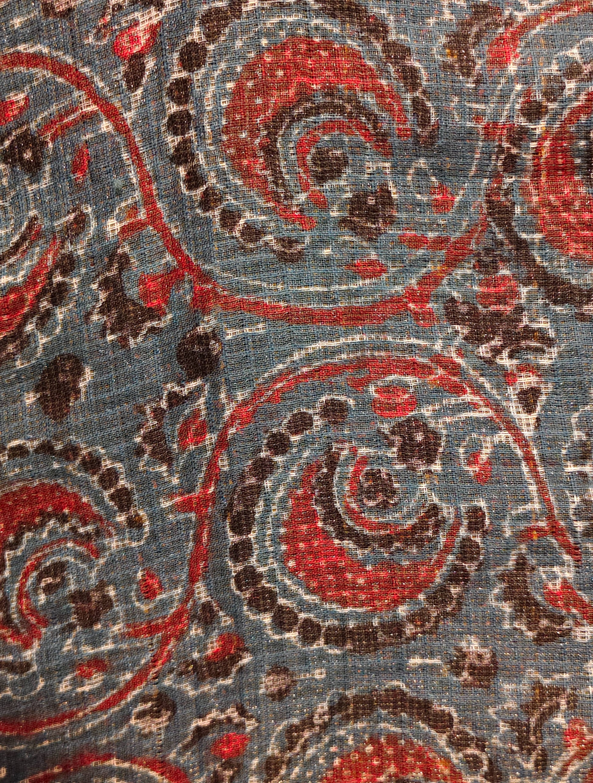 - About Ajrak:- Ajrak block-printing uses mineral-rich Indus water for colour/ mordant fixation and tonal stability. Sequential resist, dye, and wash cycles achieve geometric calibration. Natural dyes and block precision yield controlled, repeatable chromatic layering within organic variability that seems earthy yet definite.