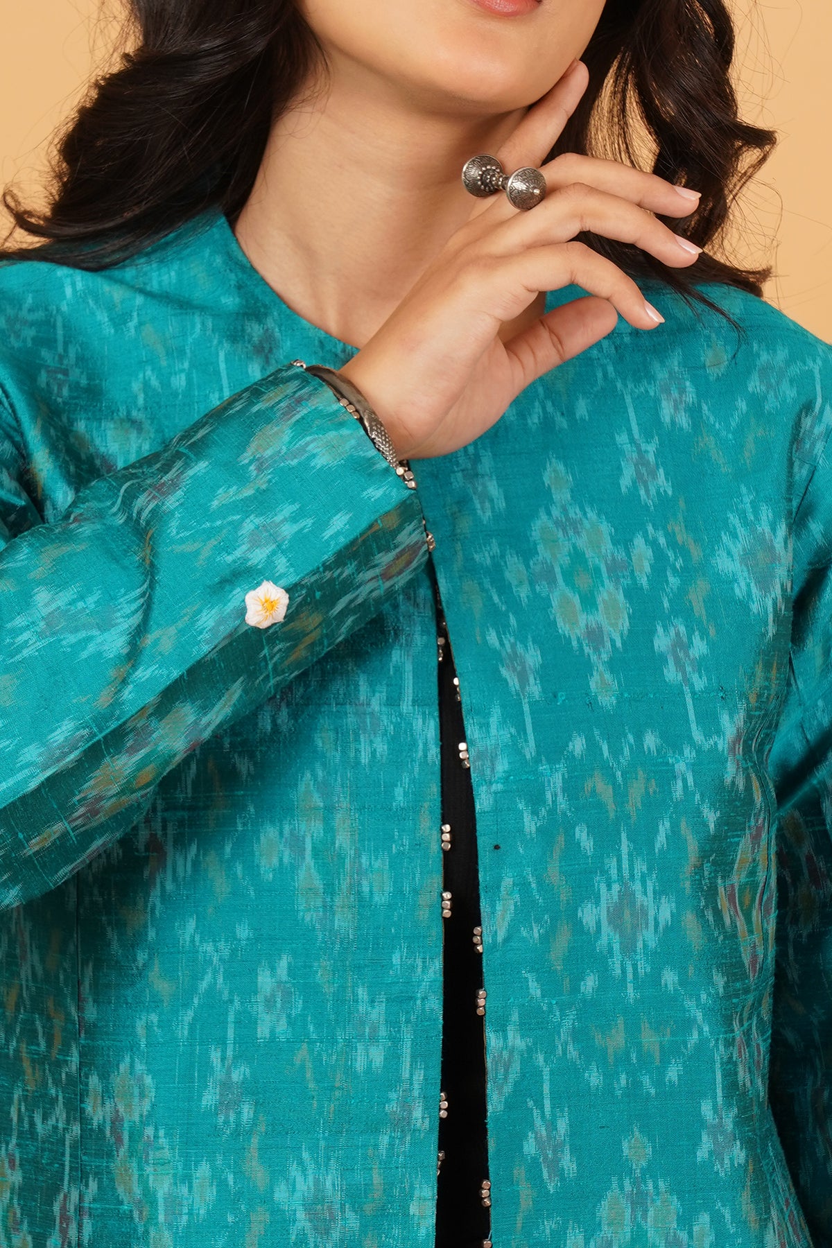 Playful yet refined, this reversible short jacket combines rawsilk and ikkat silk in aqua blue. A vibrant statement piece that highlights youthful energy and master weaving.