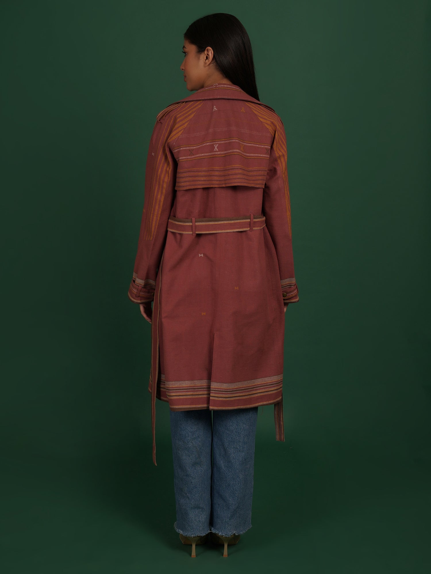Rust Brown And Purple Bhujodi Ikat Cotton Trench Jacket