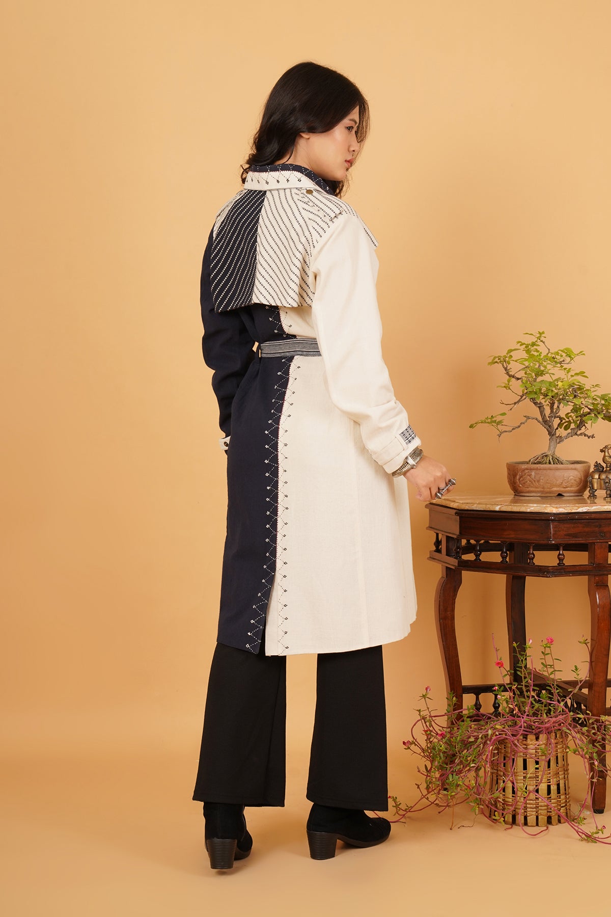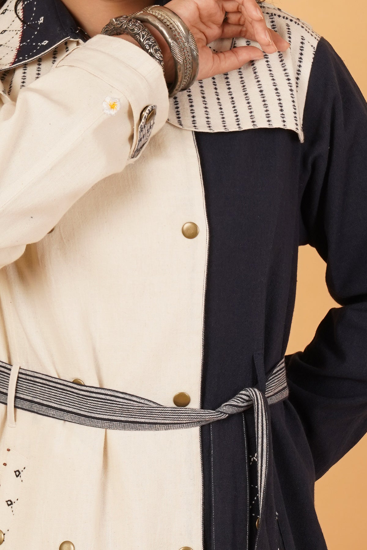 Handwoven Bhujodi weaves form the backbone of this navy and white trenchcoat. Its longline structure and full sleeves exude understated power, while the artisanal textures add quiet depth. A classic investment piece, rooted in tradition yet fit for global streets.