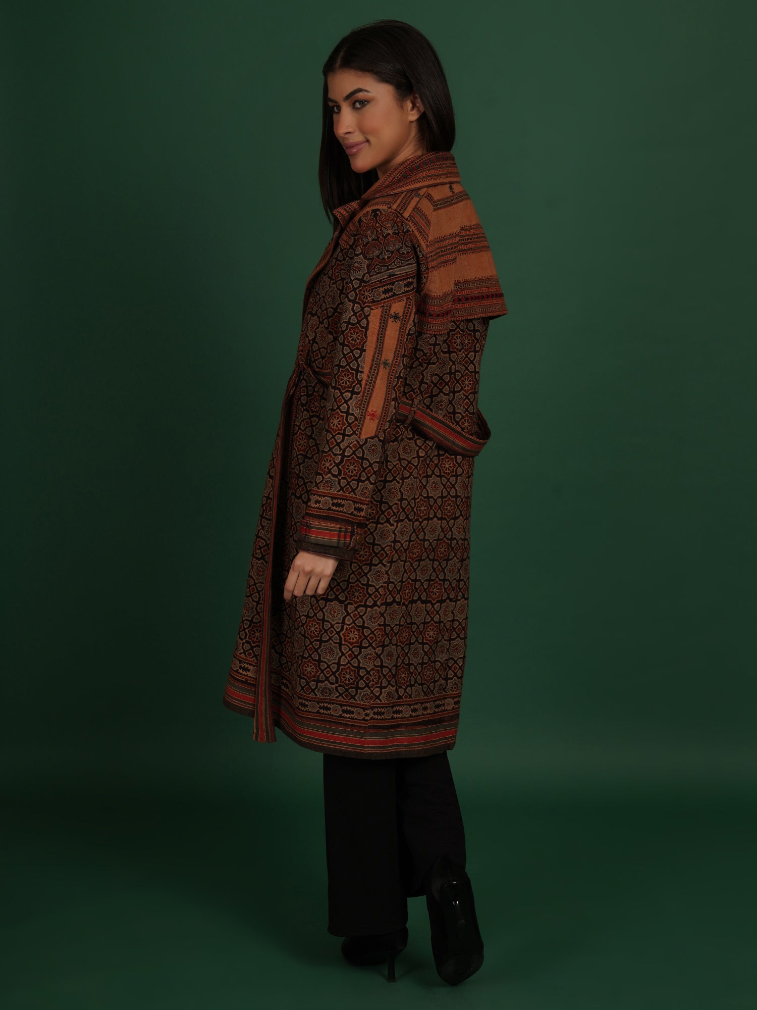 A Bhujodi Ajrak trench jacket that combines structure with printed craft. Handwoven cotton provides a strong base for Ajrak motifs. Resist printing creates symmetrical patterns through layered dyeing. Radish brown tones add warmth and depth. The long trench silhouette offers clean structure. Breathable fabric supports comfortable layering. Woven by artisans, it unites weaving and print traditions.