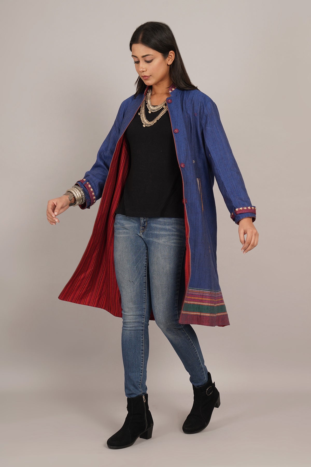 Blue Tussar Bhujodi Red Woollen Long Jacket