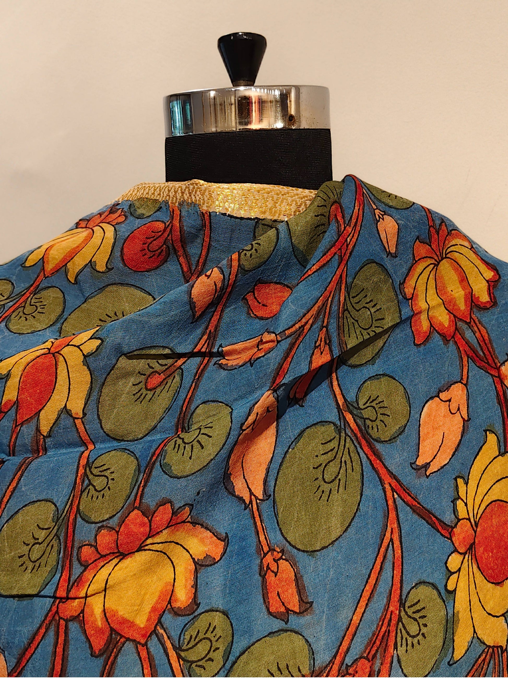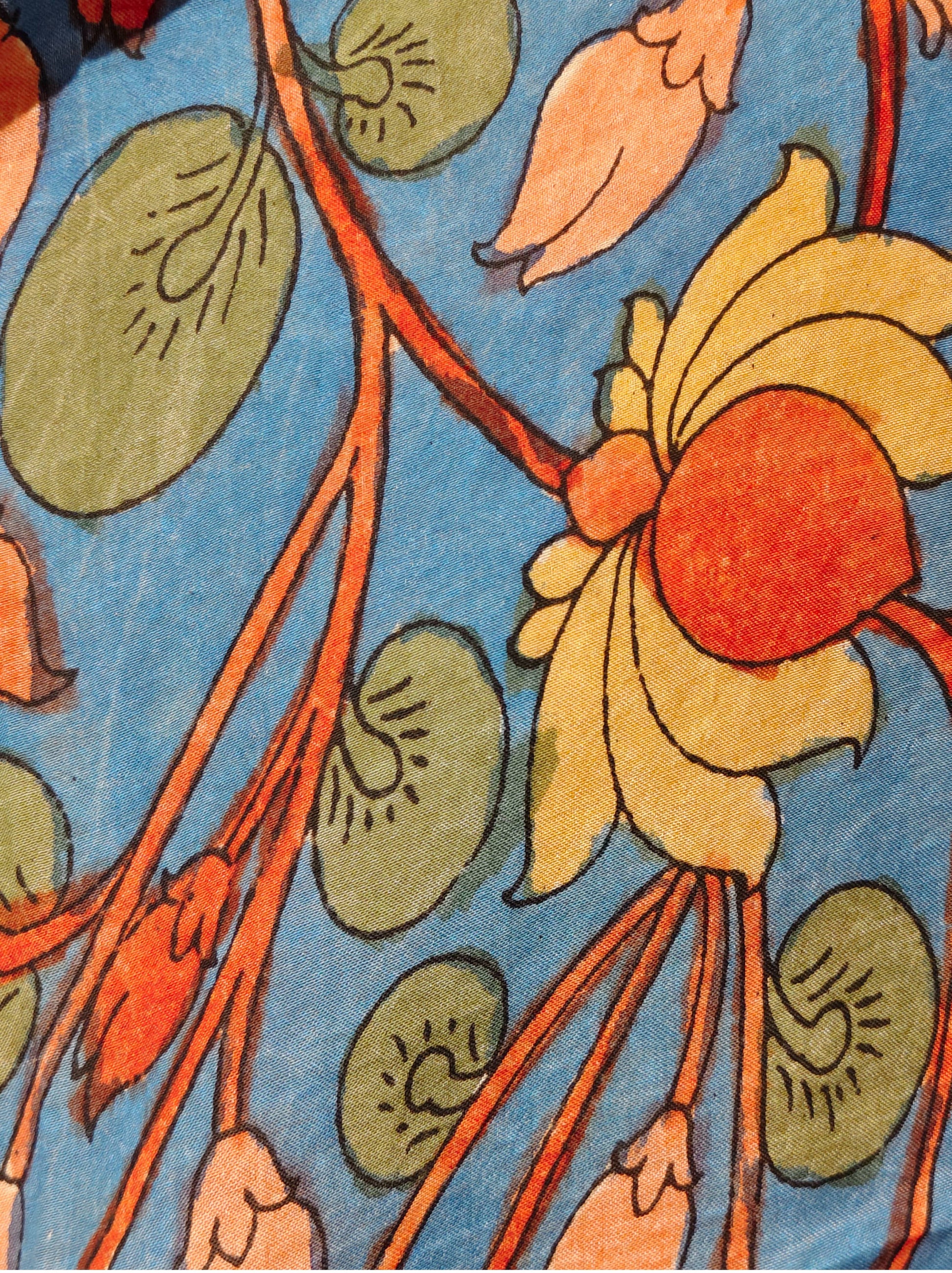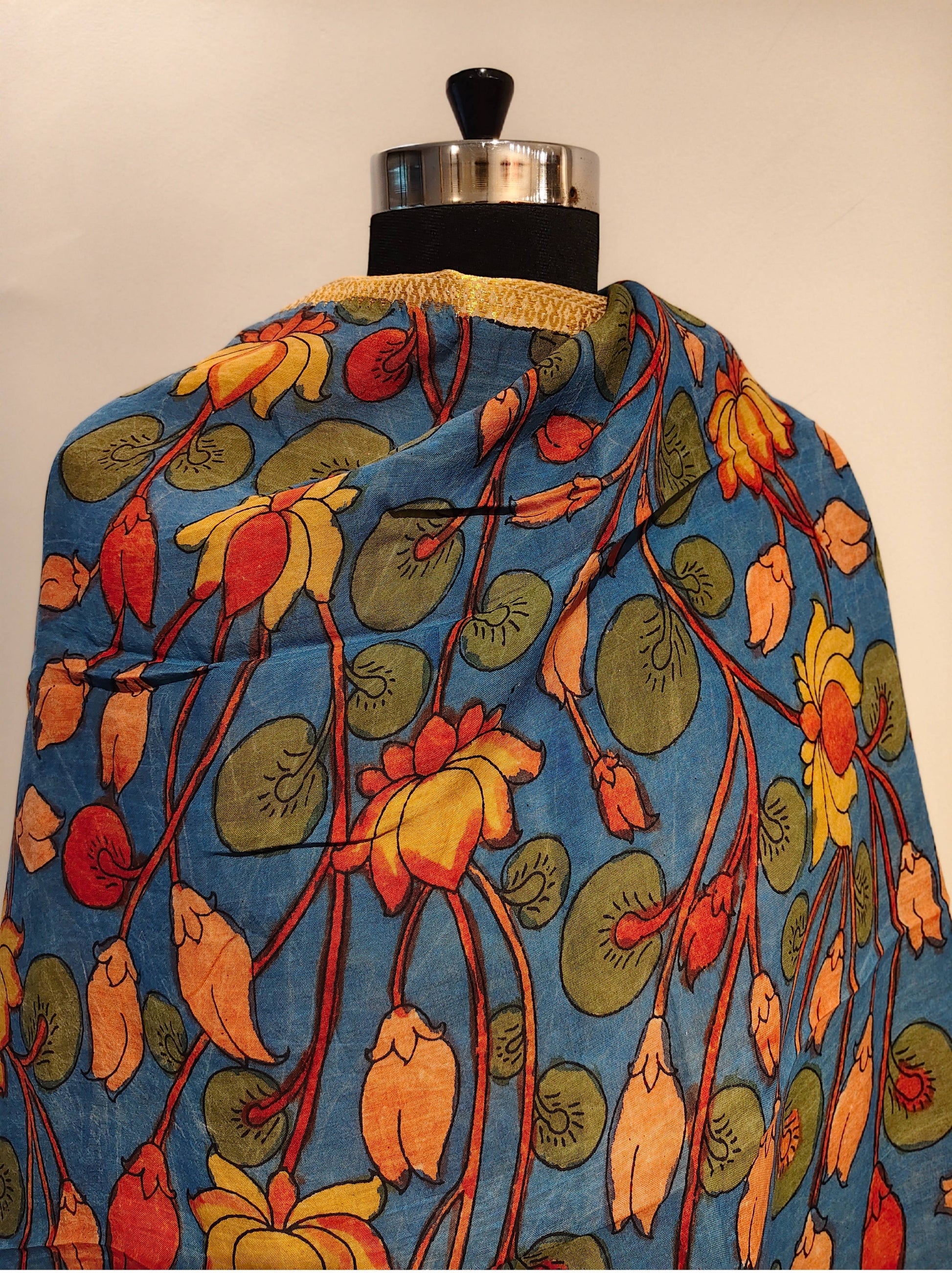 Art and textile converge in this Chanderi Kalamkari dupatta, where fine hand-painting meets the richness of silk. The result is a piece that carries narrative depth while retaining the lightness of contemporary elegance.