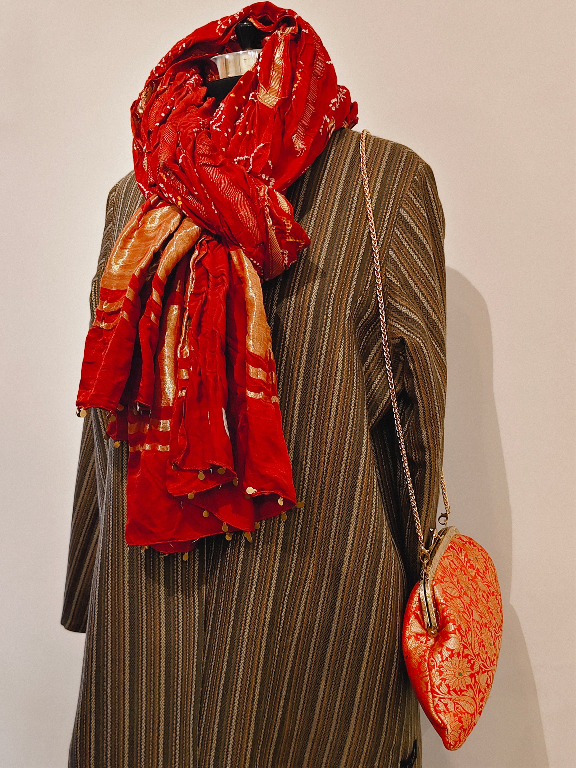 An evening bag with a 'kiss lock' is only perfect when it is made with Indian handwoven textile. This handcrafted Mirasi clutch bag with a chain strap adds a touch of quiet sofistication, so hold it close!