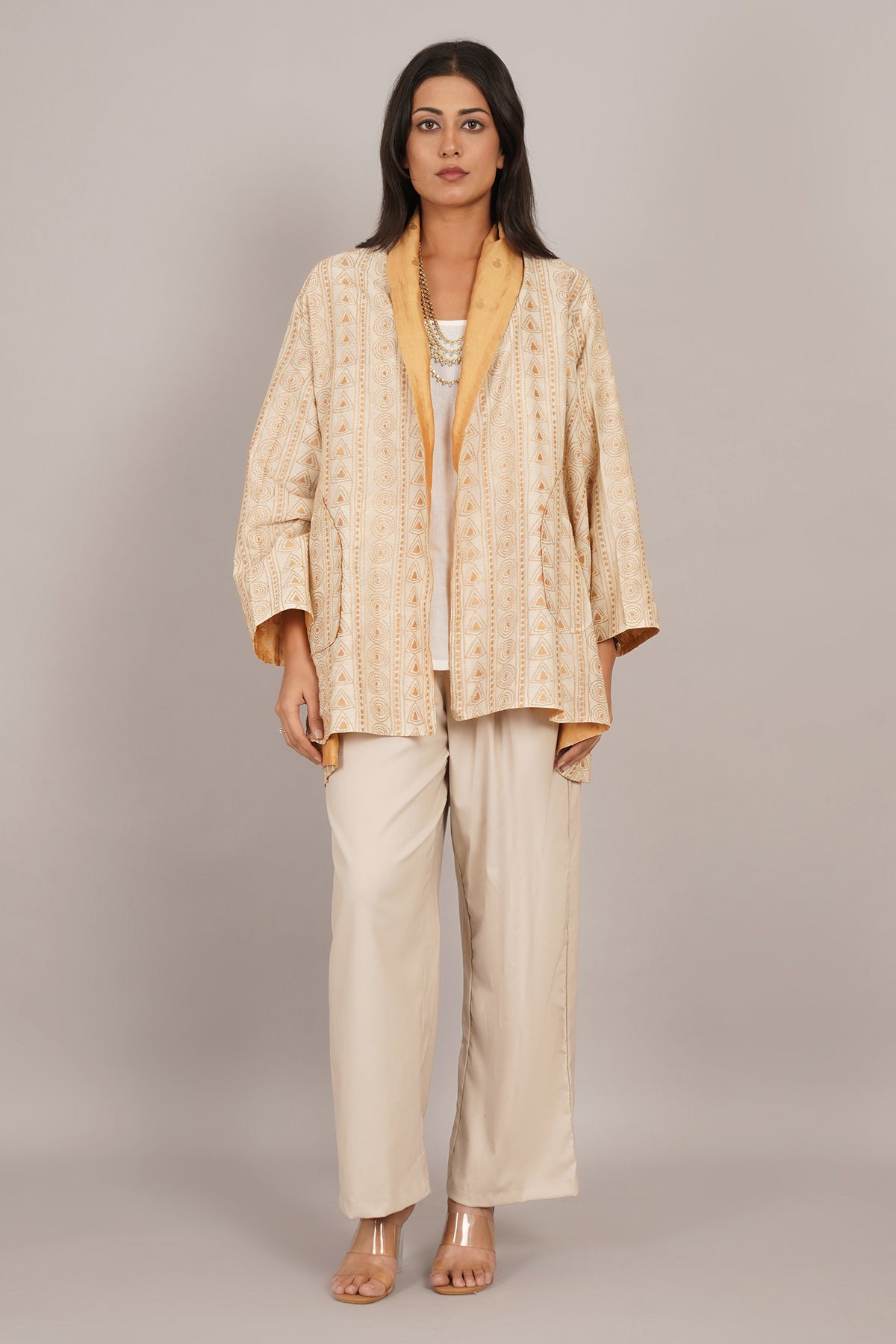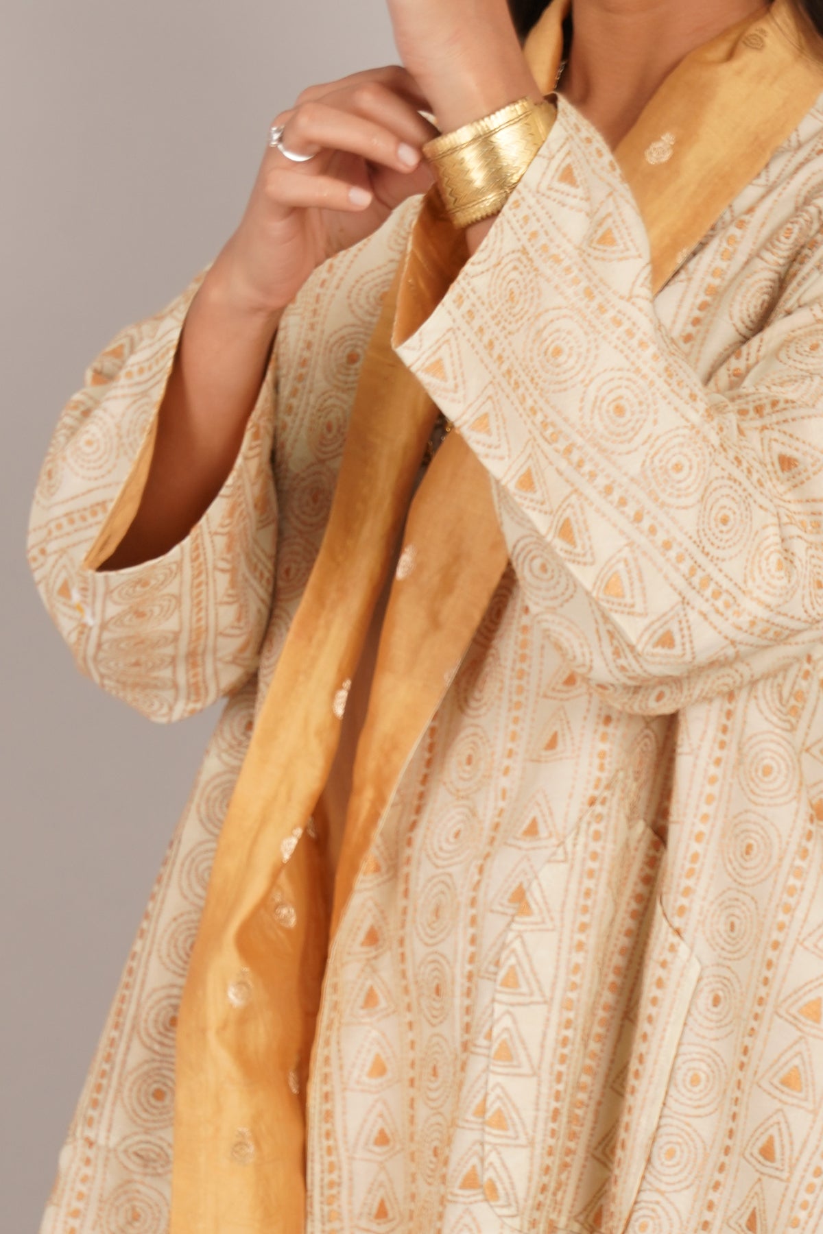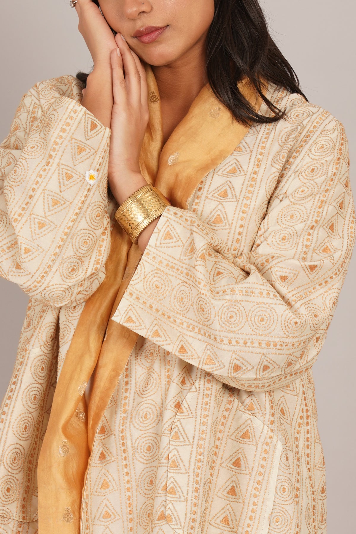 A Kantha Chanderi cape that highlights handwoven finesse and stitched detail. The cotton silk fabric carries a translucent quality with gentle lustre. Kantha embroidery adds texture through rhythmic running stitches. Cream and gold tones bring warmth and refinement. The cape remains light while offering subtle structure. Its flowing form supports easy movement and layering. Made by skilled artisans, it balances heritage craft with modern wearability.