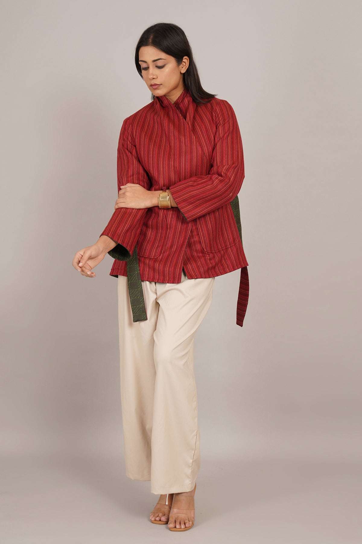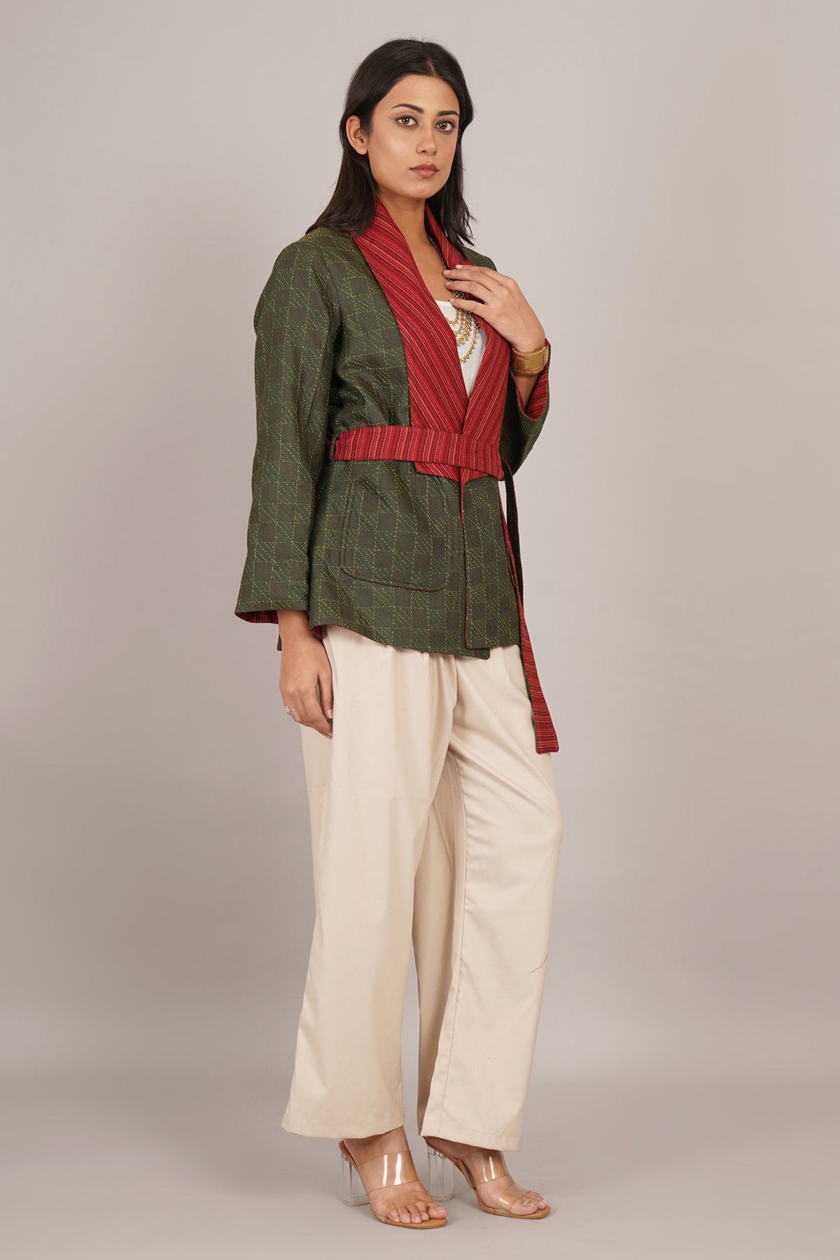 A Kantha tussar gheecha jacket that celebrates raw silk texture. Handspun gheecha yarns create visible slubs and organic surface depth. Kantha stitching adds a lightly quilted layer to the fabric. Green and red tones enhance the earthy character of the silk. Naturally breathable, it offers warmth without weight. The short form keeps the jacket versatile and easy to style. Crafted by artisans, it reflects layered textile traditions.