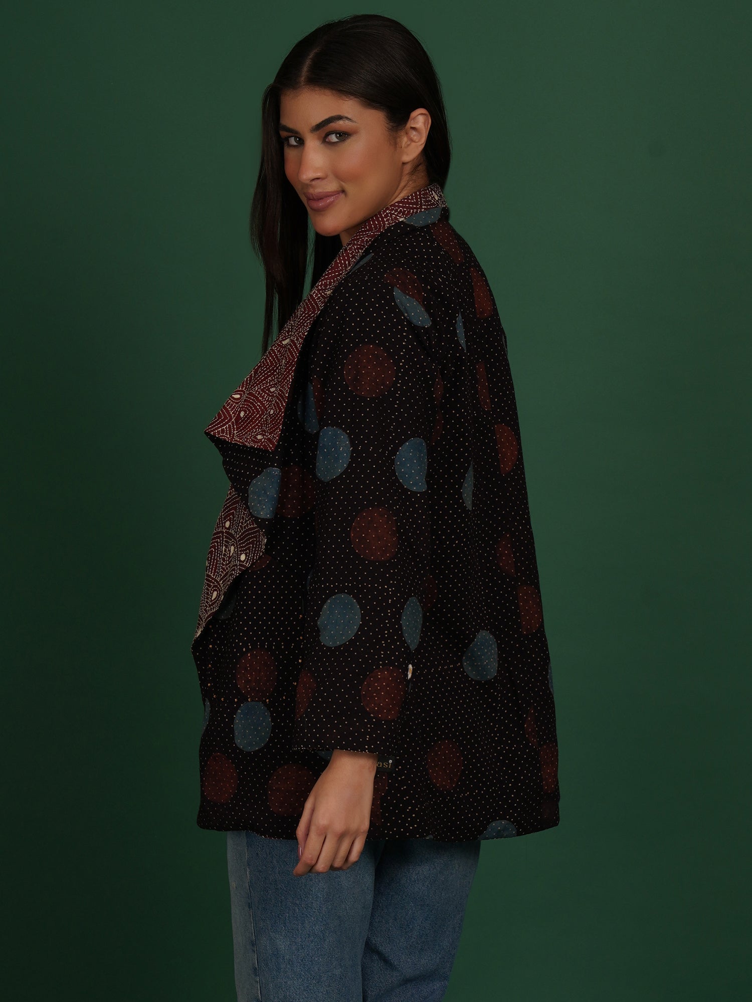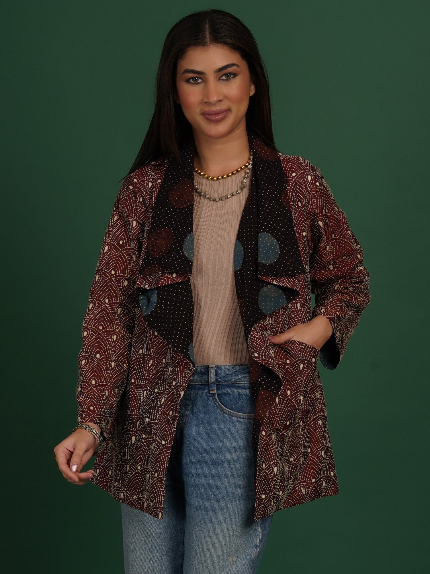 A Kantha Ajrak cape that merges printed symmetry with hand stitching. Ajrak cotton panels feature geometric motifs created through layered dyeing. Kantha stitches add softness and a quilted surface texture. The maroon tone grounds the craft in warmth.