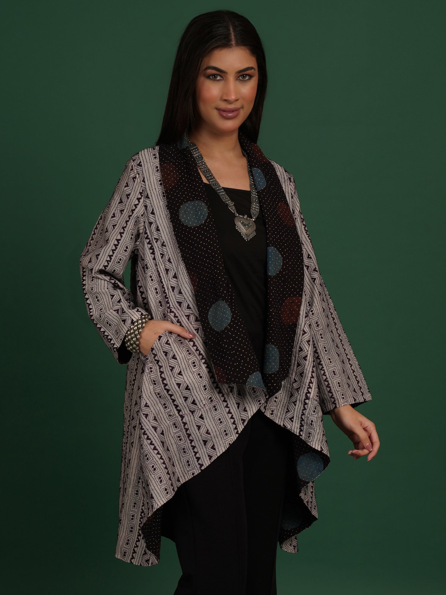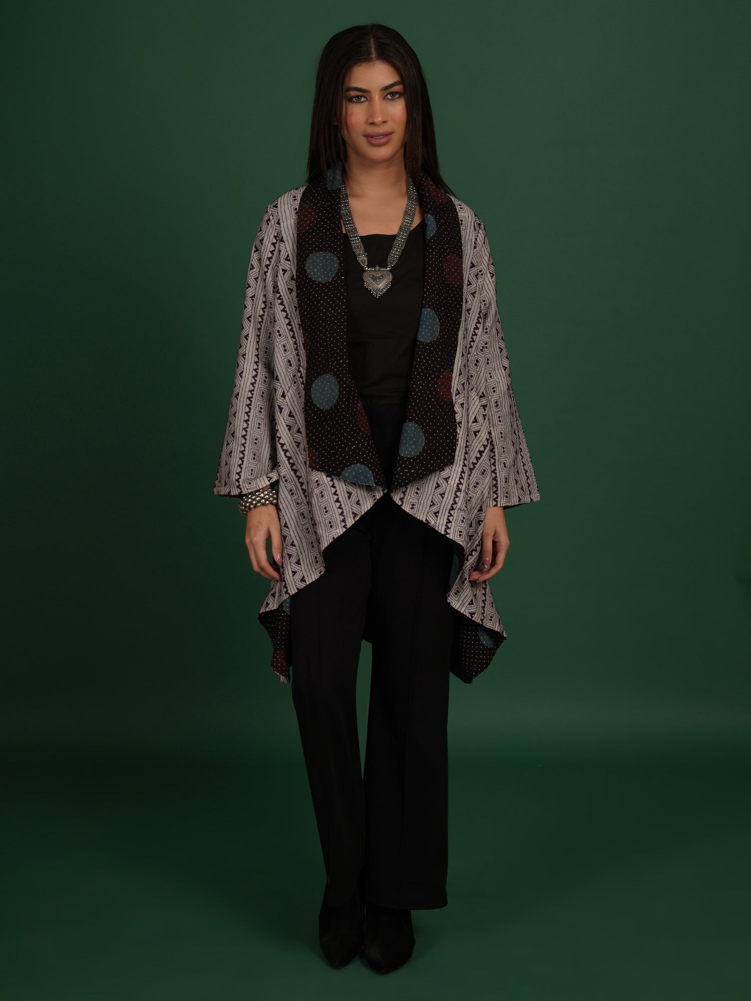 A Kantha Ajrak cape that blends printed symmetry with hand stitching. Ajrak motifs are created through layered resist dyeing on cotton. Kantha stitches add softness and gentle quilting. Off-white and purple tones give the piece subtle contrast. Lightweight fabric supports easy layering and movement. The short cape silhouette keeps the form versatile. Crafted by artisans, it brings two heritage crafts together seamlessly.