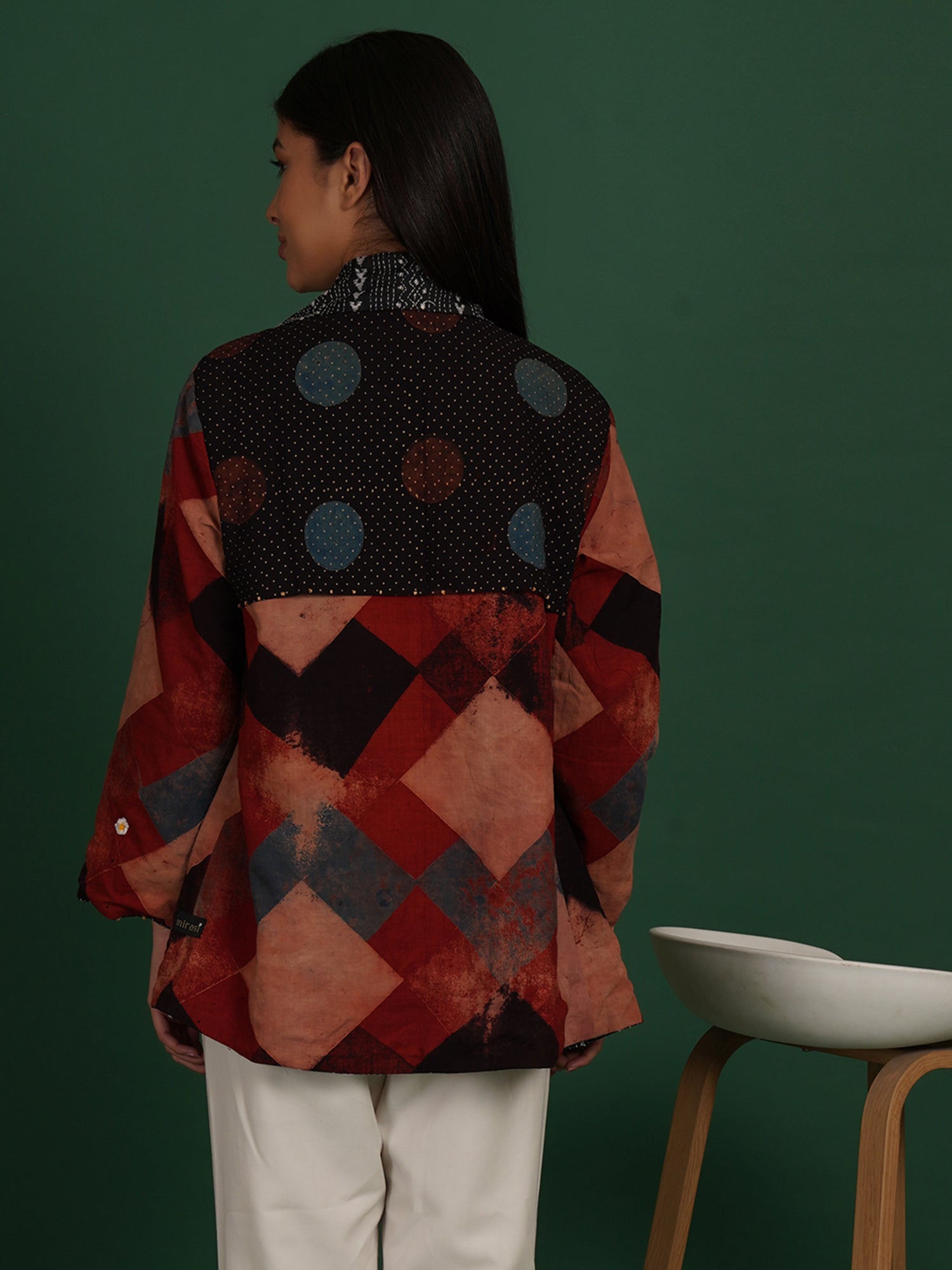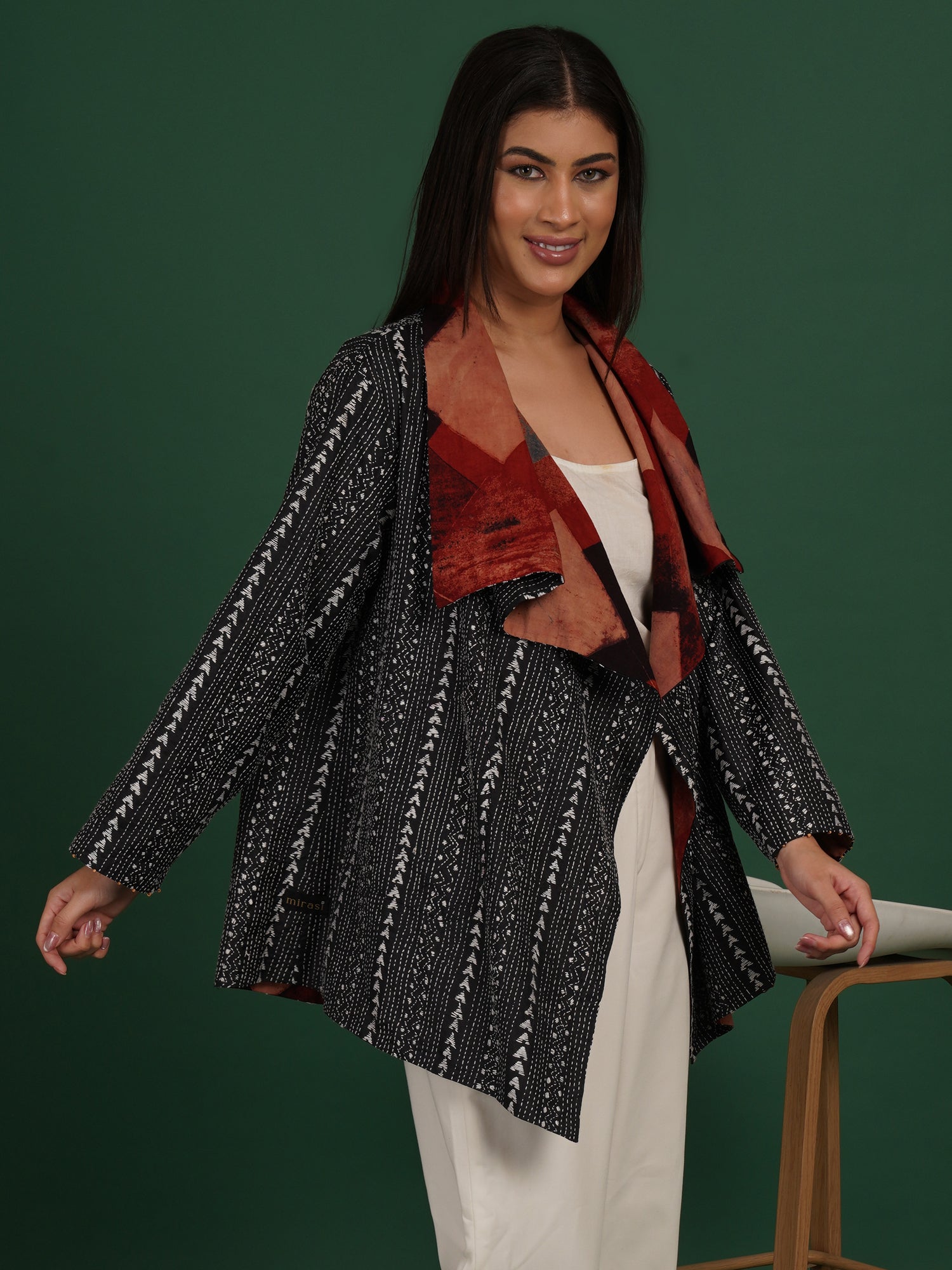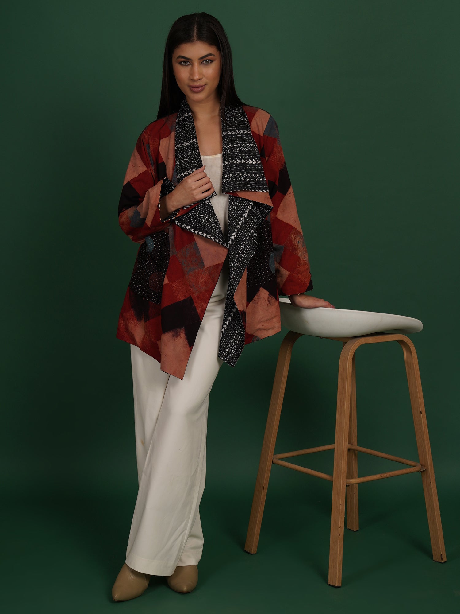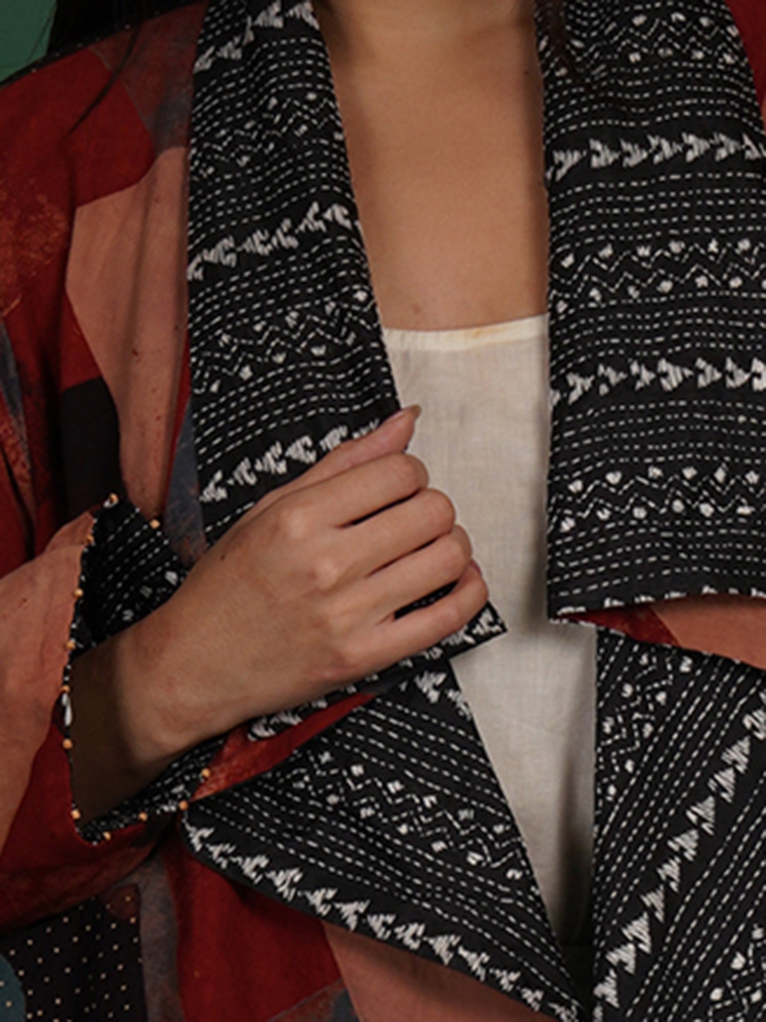 A Kantha Ajrak cape that merges printed symmetry with hand stitching. Ajrak cotton panels feature geometric motifs formed through layered dyeing. Kantha embroidery adds softness and a quilted surface texture. The short cape form keeps the piece versatile and easy to style. Lightweight fabric supports comfortable layering. Designed for fluid movement and everyday wear. Handcrafted by artisans, it brings two heritage crafts together.