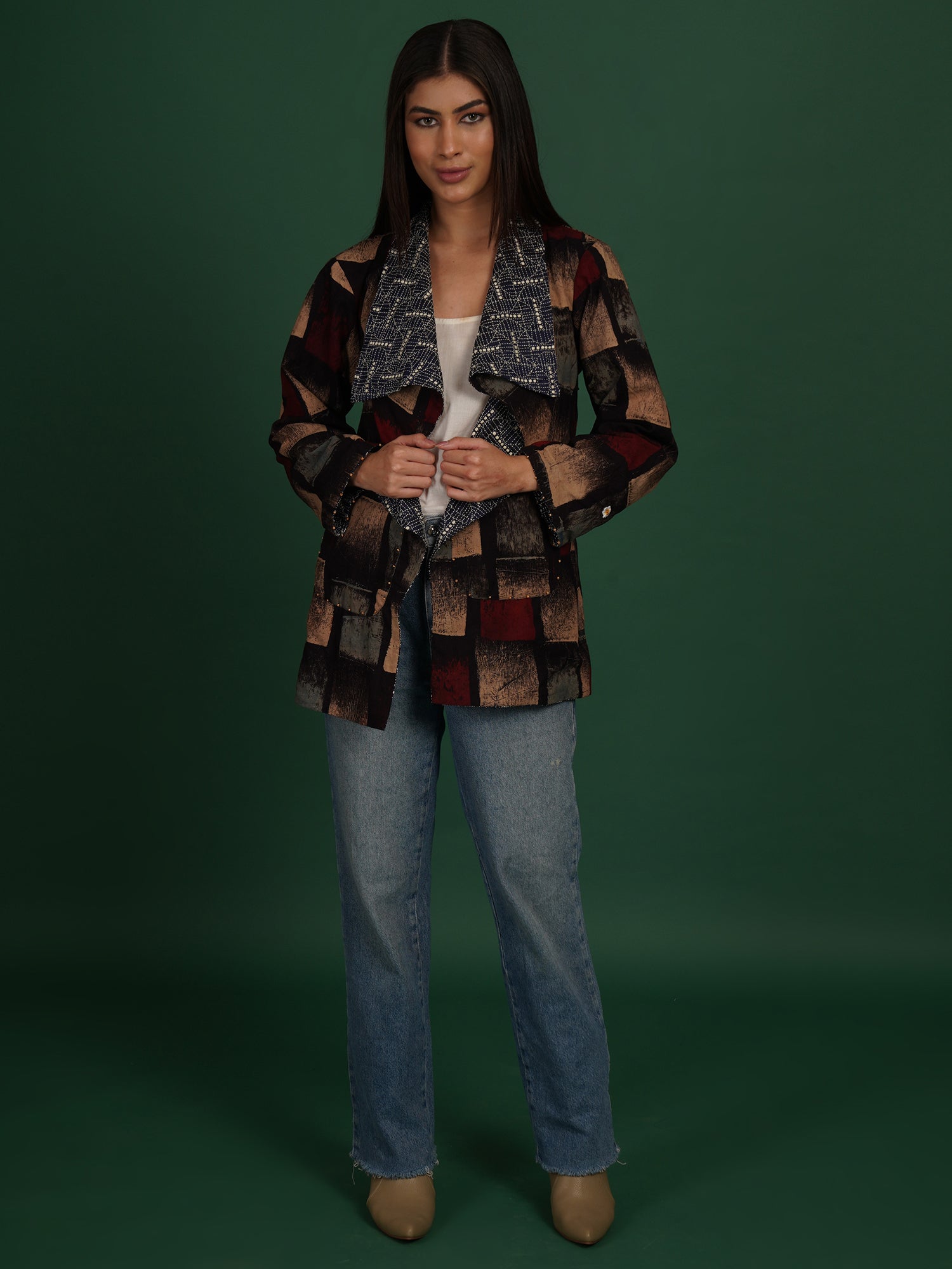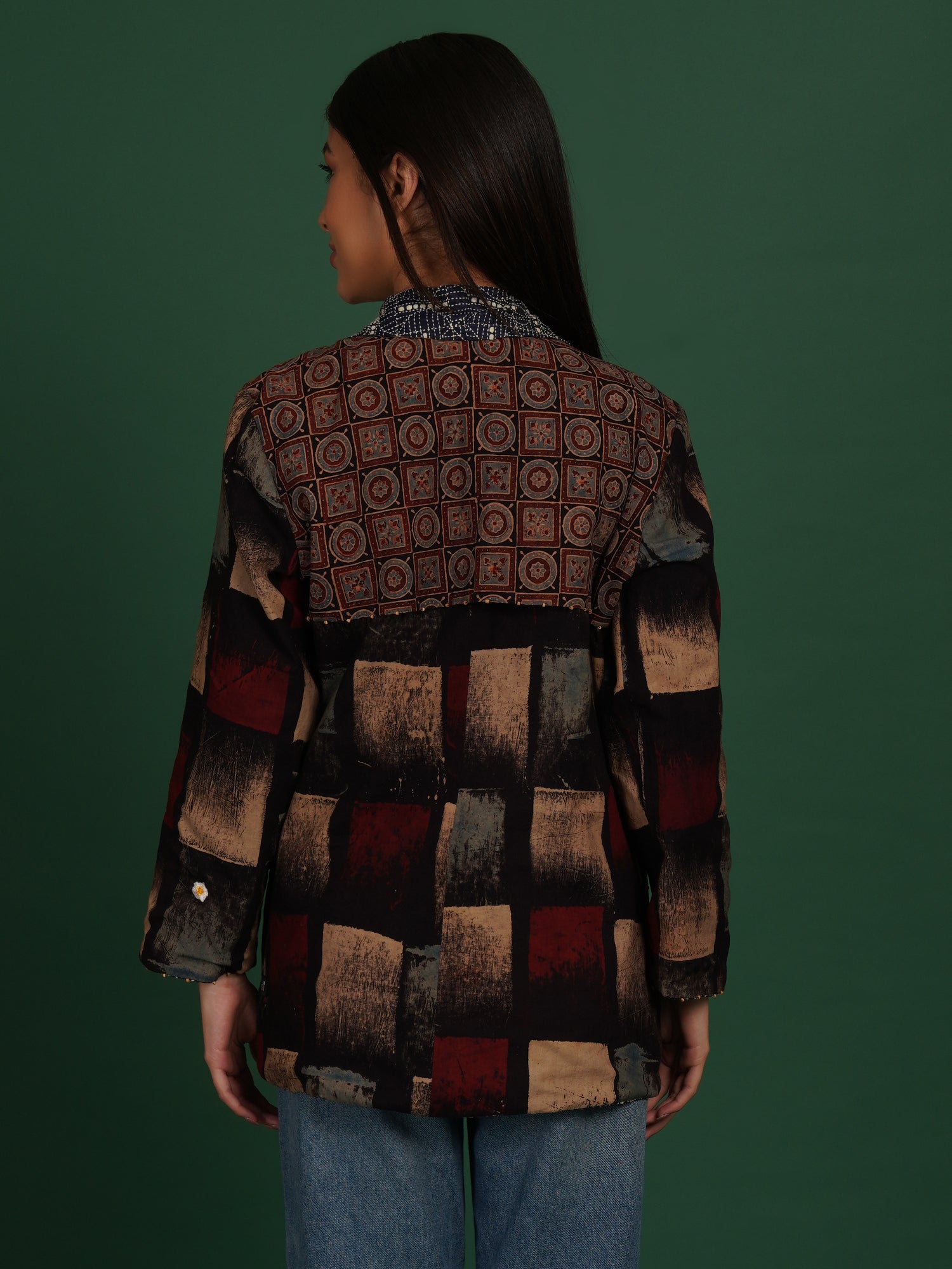 A Kantha Ajrak overlay that highlights printed tradition and stitch. Ajrak motifs emerge through layered resist dyeing on cotton. Kantha embroidery adds a softly quilted surface texture. The royal blue tone adds depth and richness. Lightweight fabric keeps the jacket comfortable. The short length allows easy styling and movement.