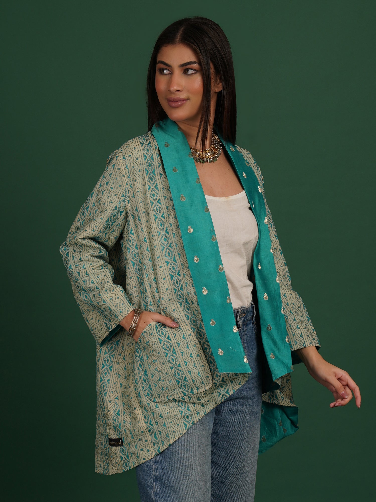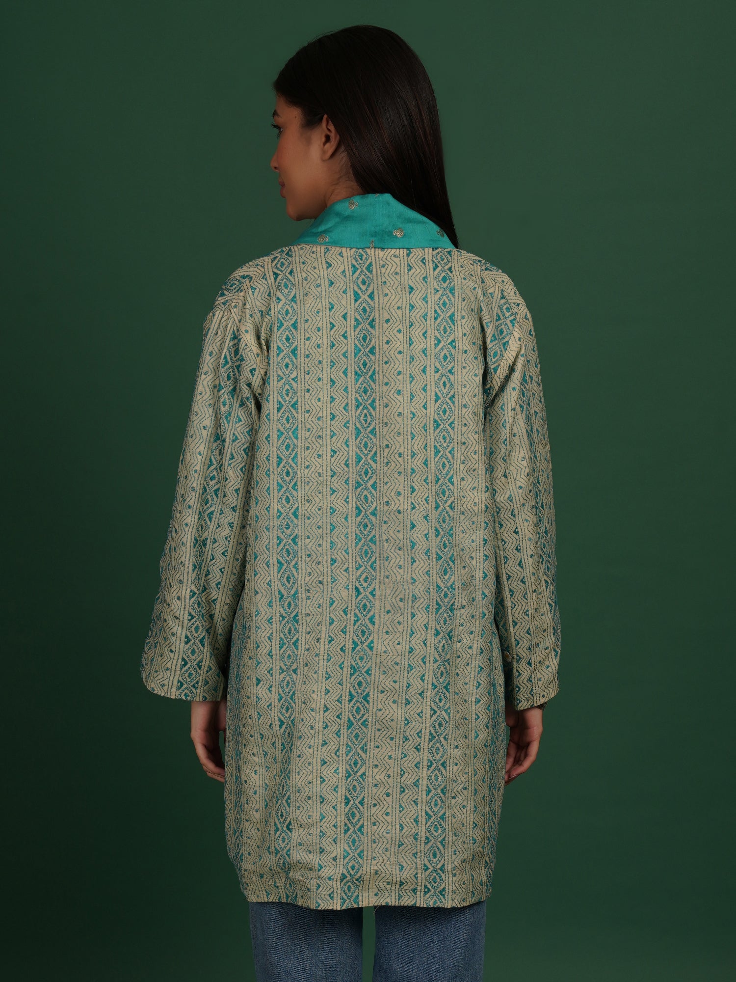 A Kantha Chanderi cape that highlights lightness and surface texture. The cotton silk fabric is handwoven to achieve airy softness. Kantha stitches add gentle quilting across the surface. Sky blue and white tones bring calm and clarity. The short cape form keeps the piece easy to layer. Fluid drape allows natural movement. Handcrafted by artisans, it blends delicacy with tradition.
