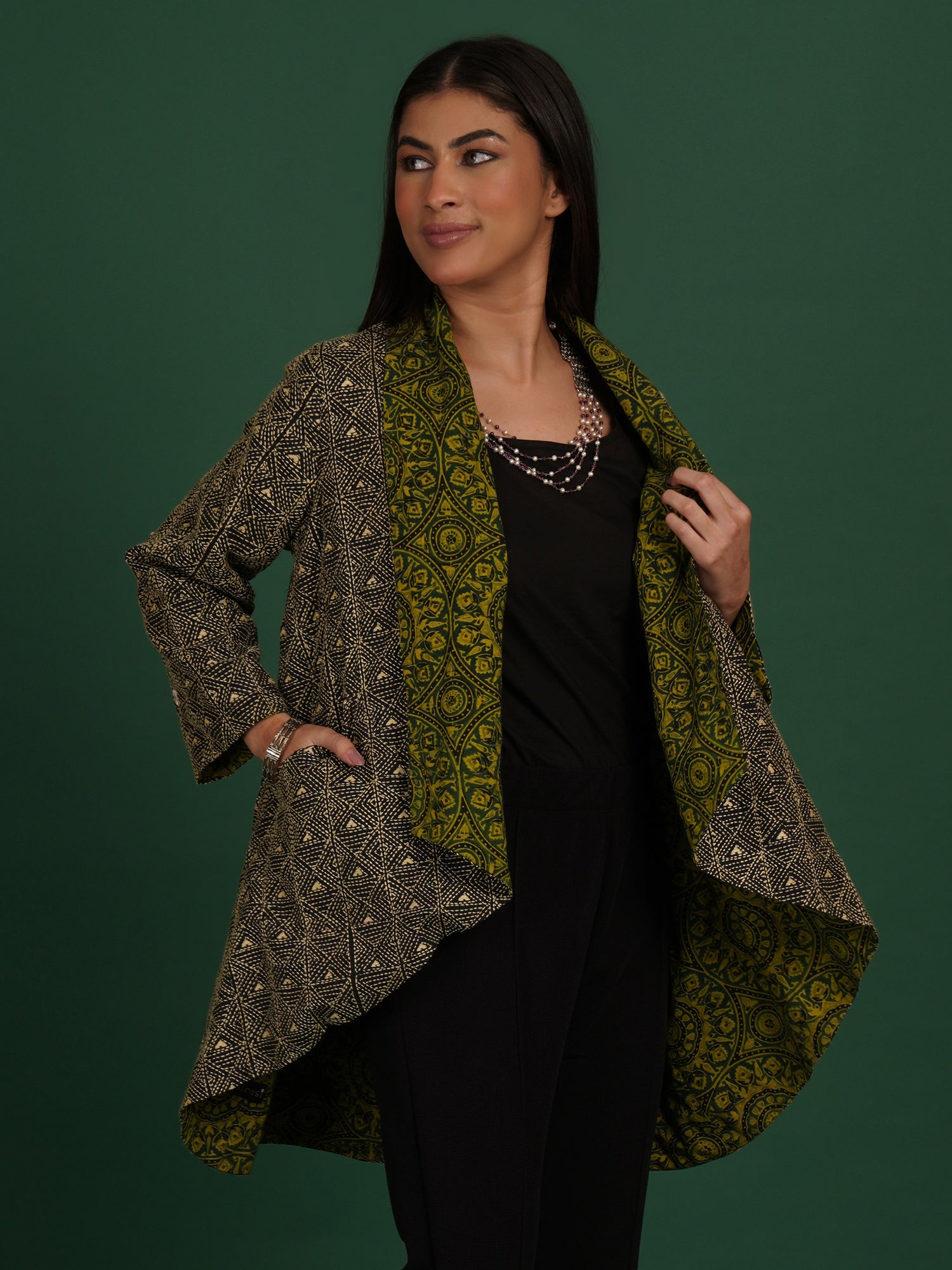 A Kantha Ajrak cape that brings together woven pattern and stitched texture. Ikat cotton panels display softened motifs formed through resist-dyed yarns. Kantha embroidery creates a lightly quilted surface across the fabric. The dark green tone adds depth while remaining understated. Lightweight cotton allows fluid movement and comfort. The short cape form keeps it easy to layer. Handcrafted by artisans, it reflects harmony between weaving and embroidery.