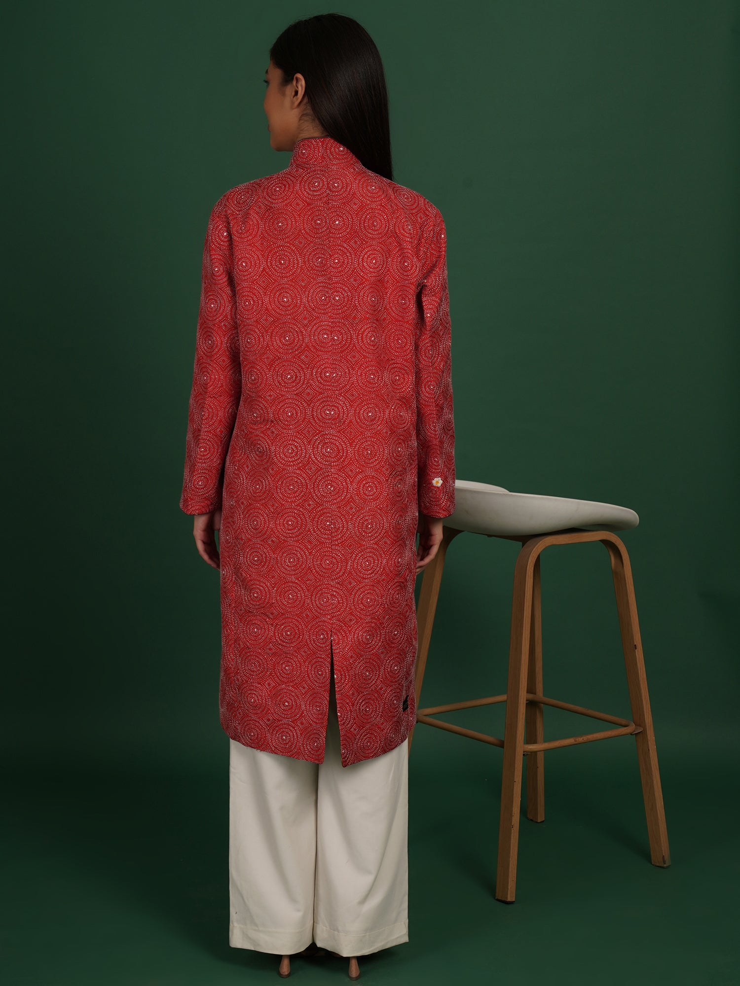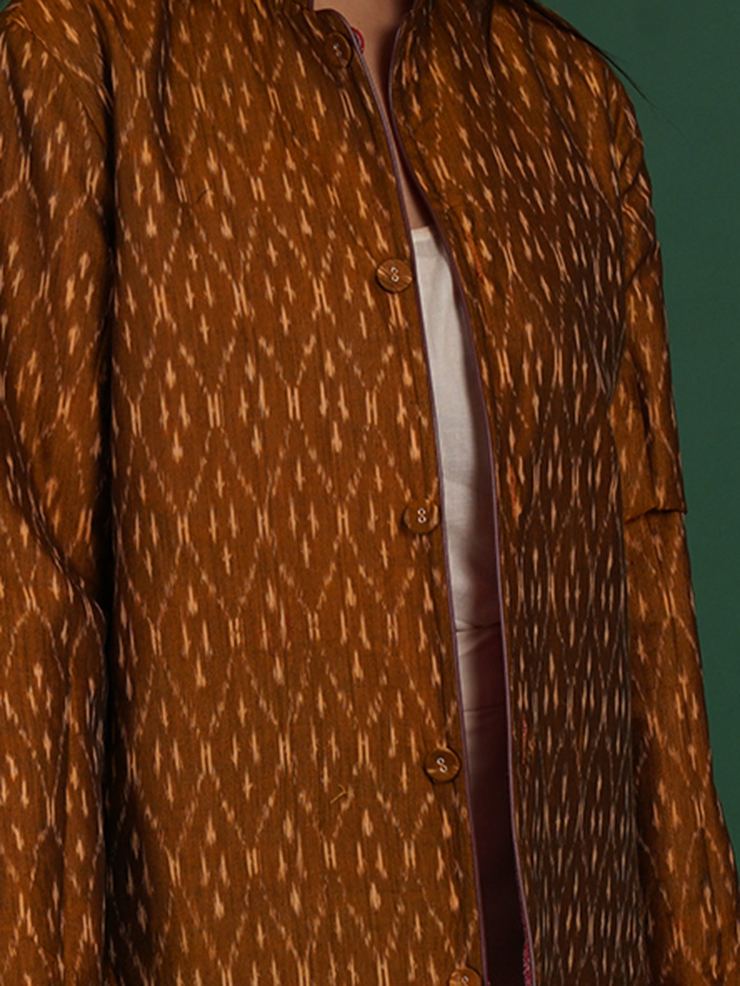 A Kantha Ikat cotton long jacket shaped by weave and stitch traditions. Ikat motifs emerge through resist-dyed yarns woven into cotton panels. Kantha stitches create gentle quilting across the surface. Red and yellow tones add warmth and visual contrast. The long form offers structure while remaining comfortable. Breathable cotton supports layered dressing. Crafted by artisans, it reflects layered textile heritage.