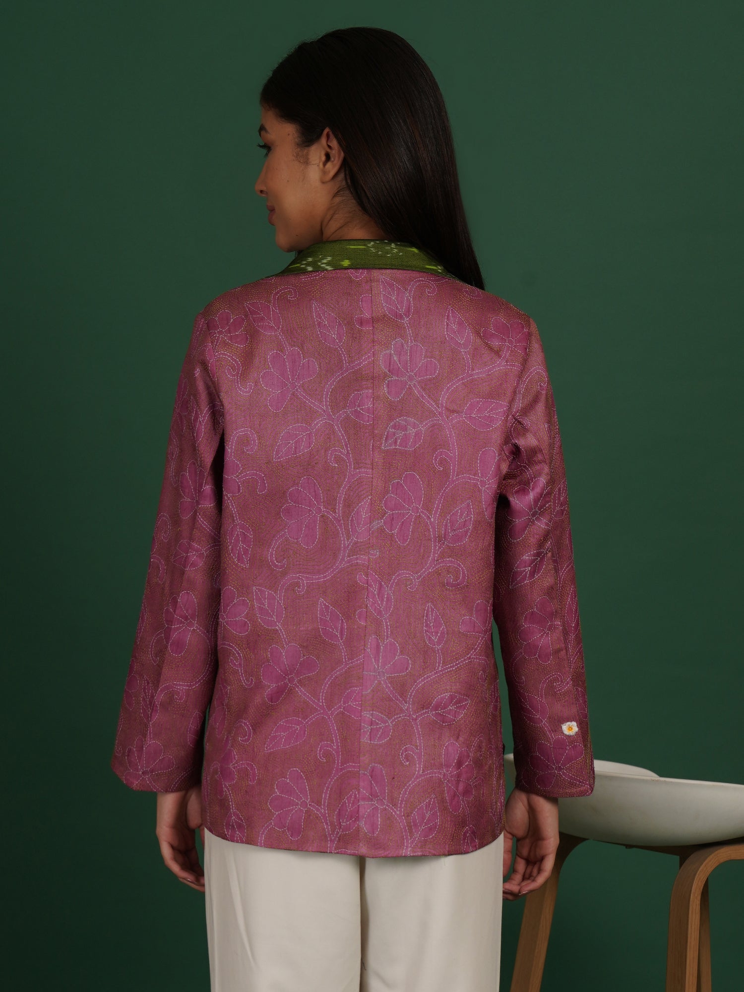 A Kantha Ikat cotton short jacket that brings together woven pattern and stitch. Ikat cotton panels display softened motifs formed through resist-dyed yarns. Kantha embroidery adds a lightly quilted texture across the surface. Green and pink tones give the jacket freshness and contrast. Breathable cotton keeps it comfortable for everyday wear. The short silhouette allows ease of movement and layering. Handcrafted by artisans, it reflects balanced textile craftsmanship.