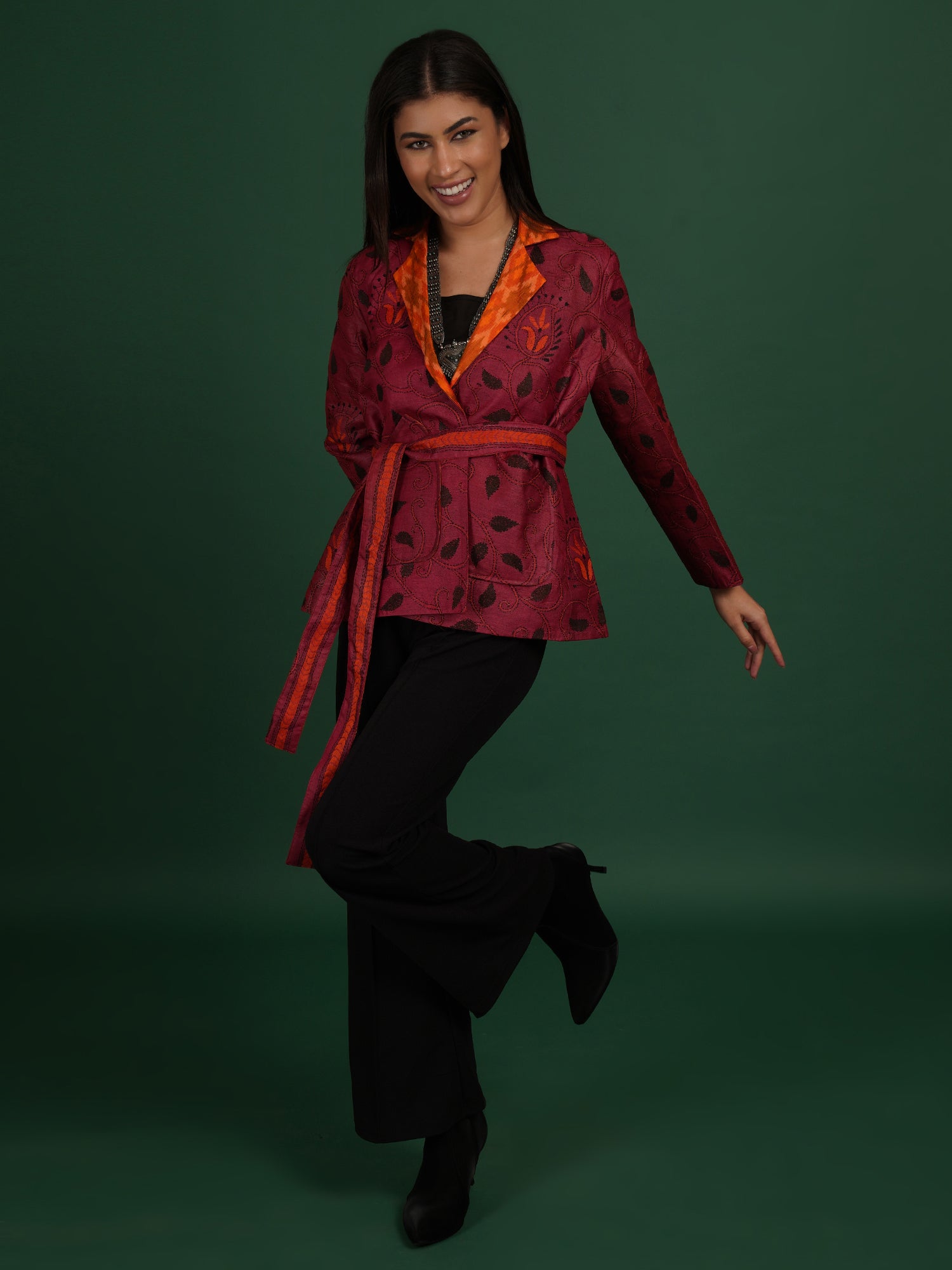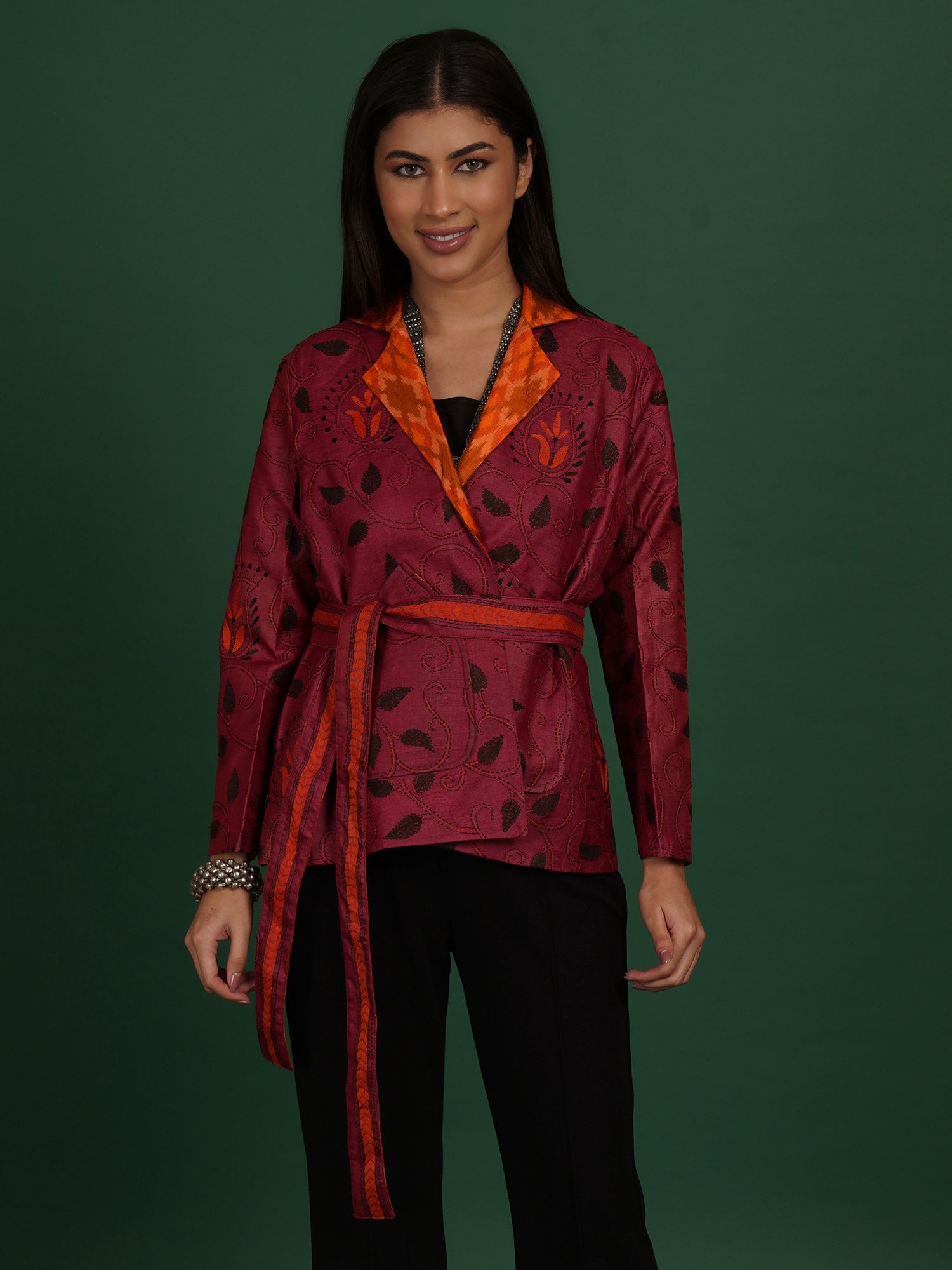 Maroon And Orange Kantha Raw Silk Ikat Short Jacket