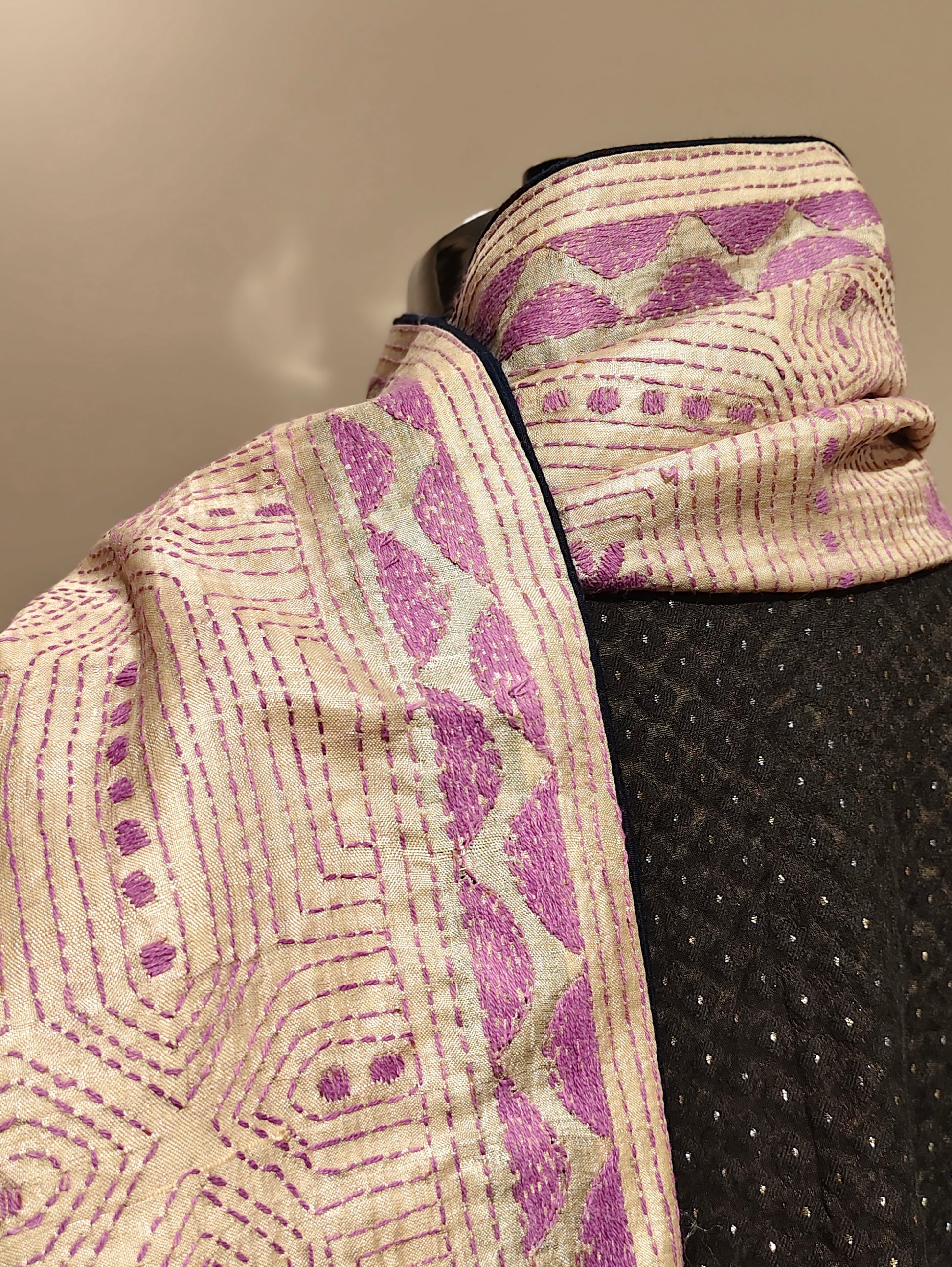 This silk Kantha stole reflects the patience of handmade artistry through intricate, continuous stitching. Its subtle patterns and fluid drape bring heritage craftsmanship into a form both versatile and elegant.