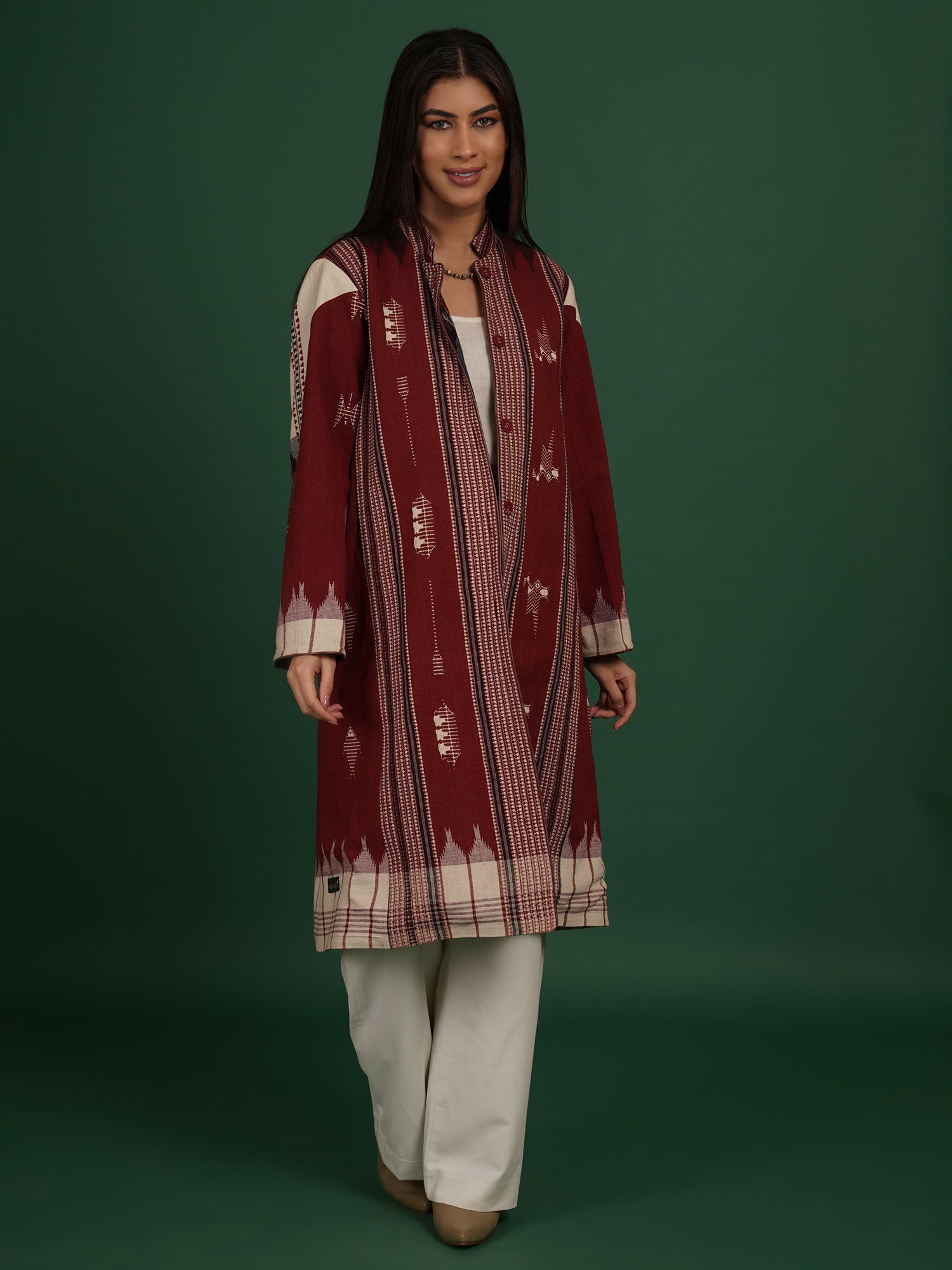 A Kotpad Ajrak long jacket that brings together earthy dyeing and printed craft. Handwoven cotton is coloured using vegetable-based natural pigments. Ajrak motifs emerge through layered resist printing techniques. The maroon tone deepens the organic character of the fabric. The long silhouette adds structure and visual presence.