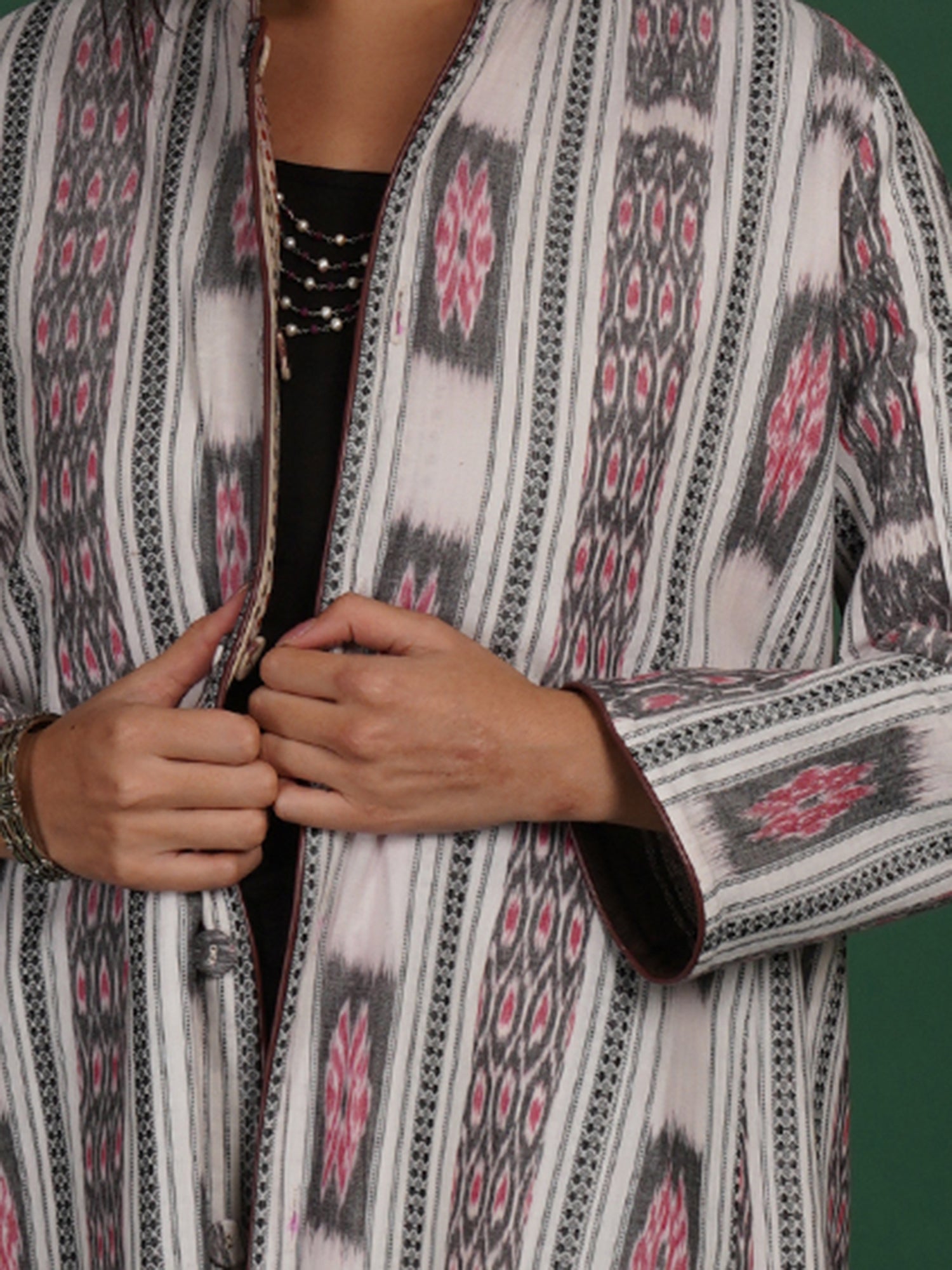 The off-white tone keeps the jacket understated. The long form adds structure without heaviness. Breathable fabric supports comfortable wear. Crafted by artisans, it carries regional textile heritage forward.