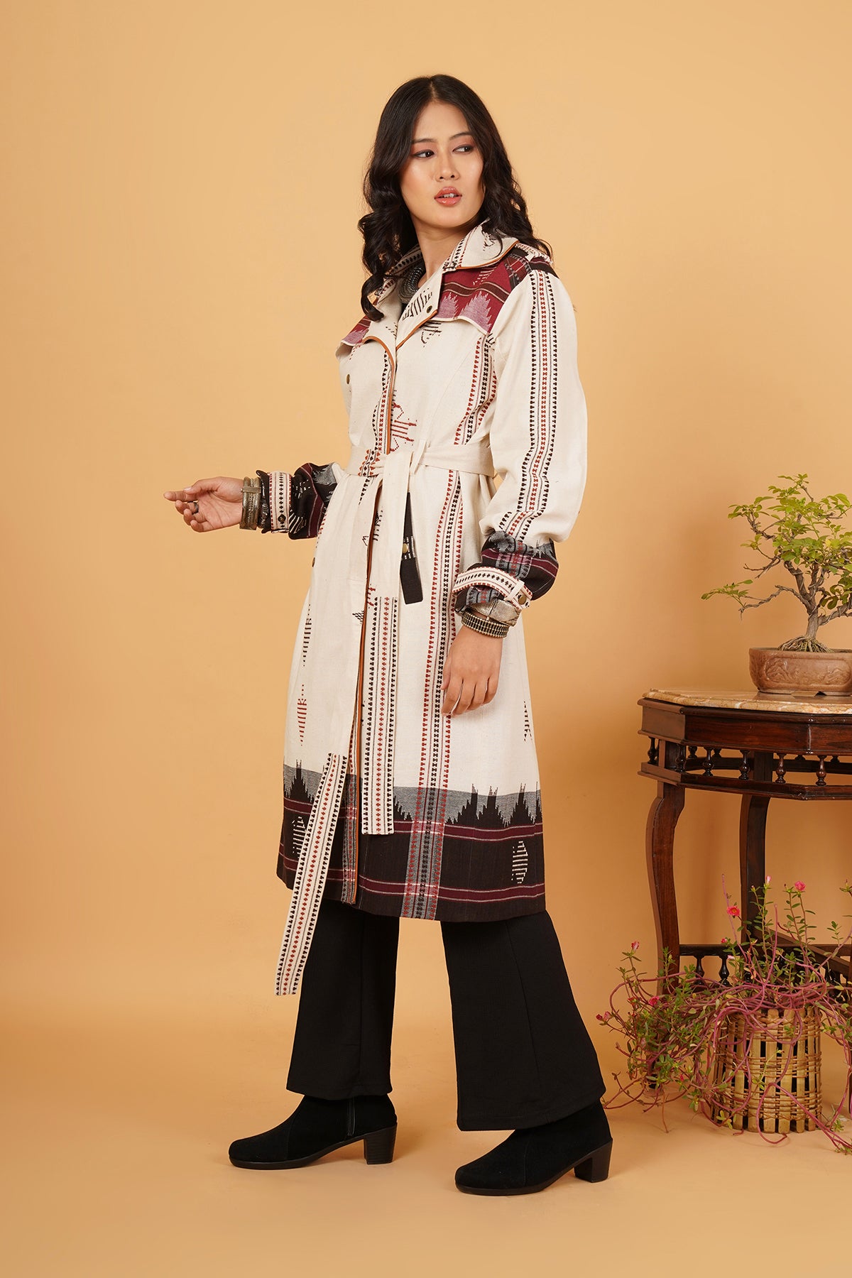 A medium-length trenchcoat that celebrates Kotpad weaving in cream and black. A neutral masterpiece, effortlessly adaptable to modern wardrobes.