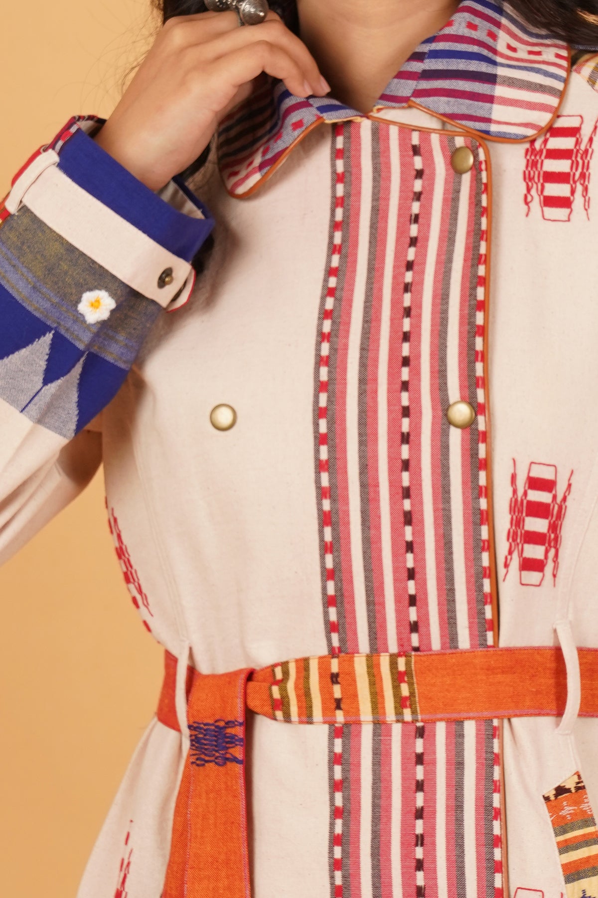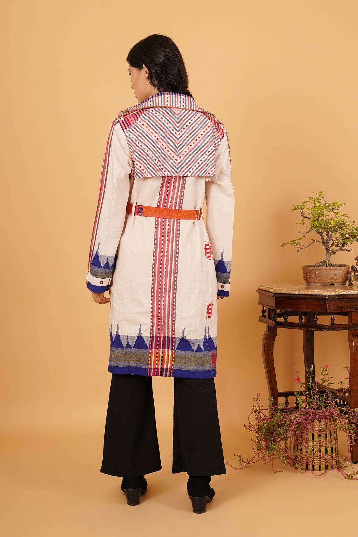 Handwoven in the earthy textures of Kotpad, this multicoloured trenchcoat jacket is a vibrant ode to tradition. The full-sleeved silhouette brings structure to the fluidity of its weave, while the play of hues reflects the spirit of the community that nurtures this craft. Contemporary in cut yet timeless in essence, it is designed for those who carry heritage as a living, colourful narrative.