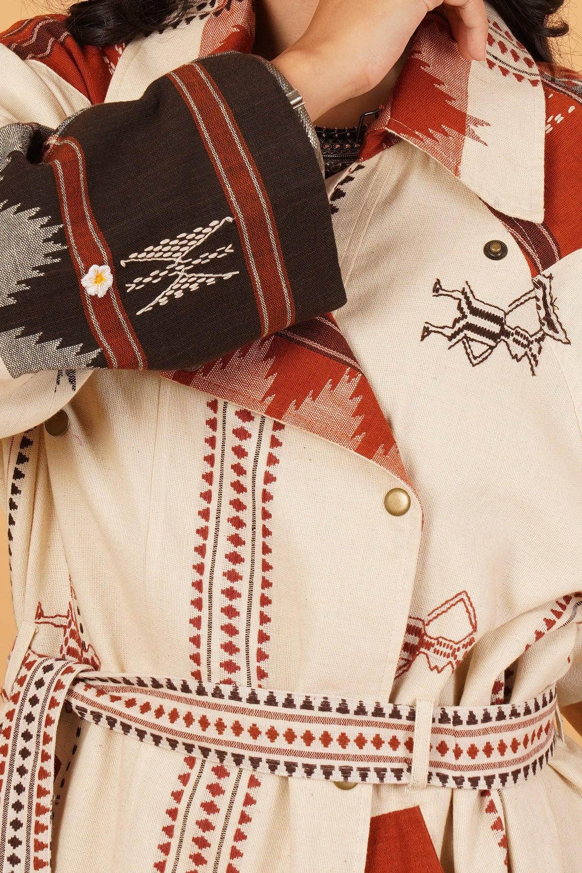 In bold white, black, and red, this Kotpad trenchcoat speaks with graphic clarity. Woven heritage, worn with modern attitude.