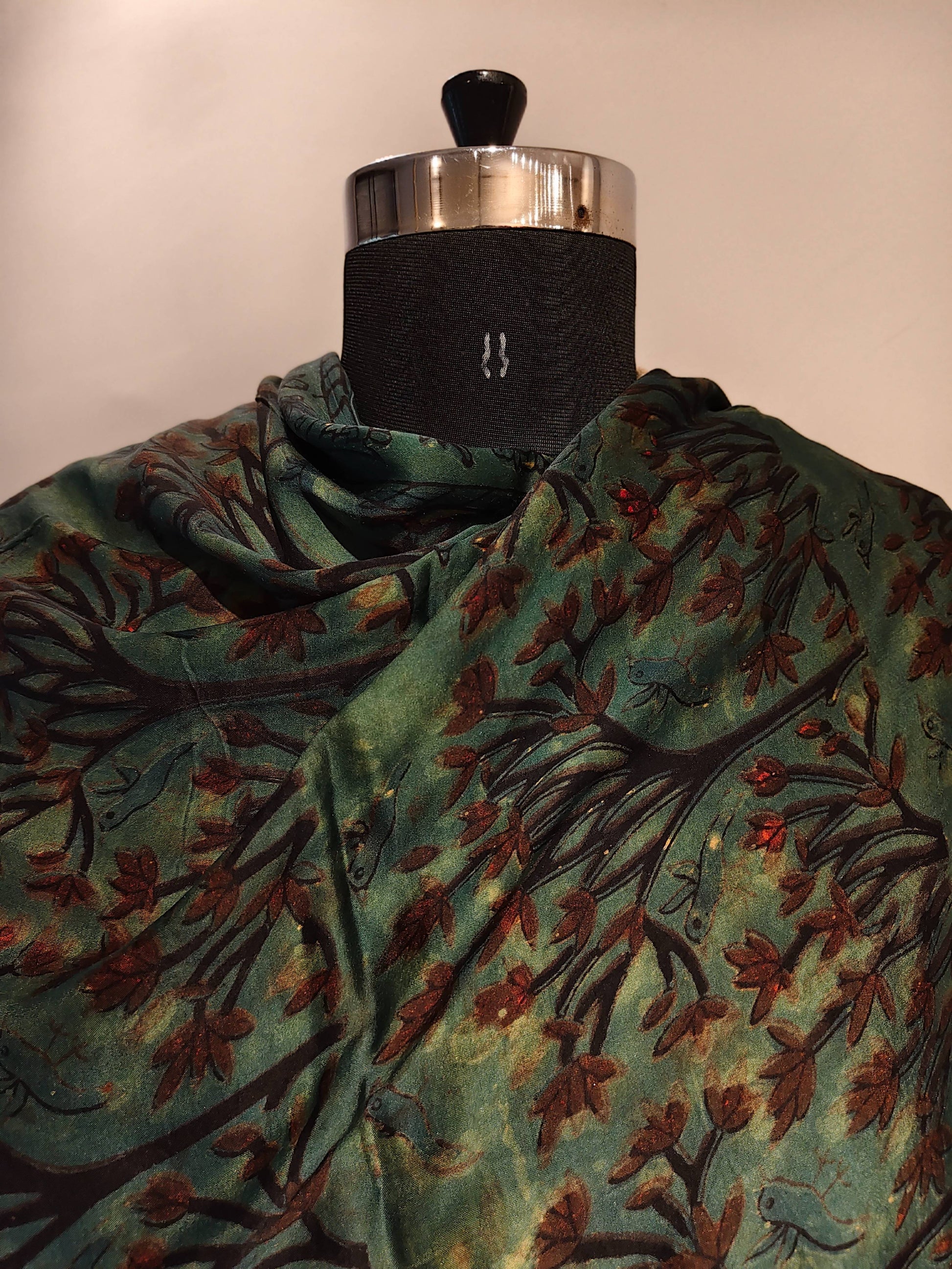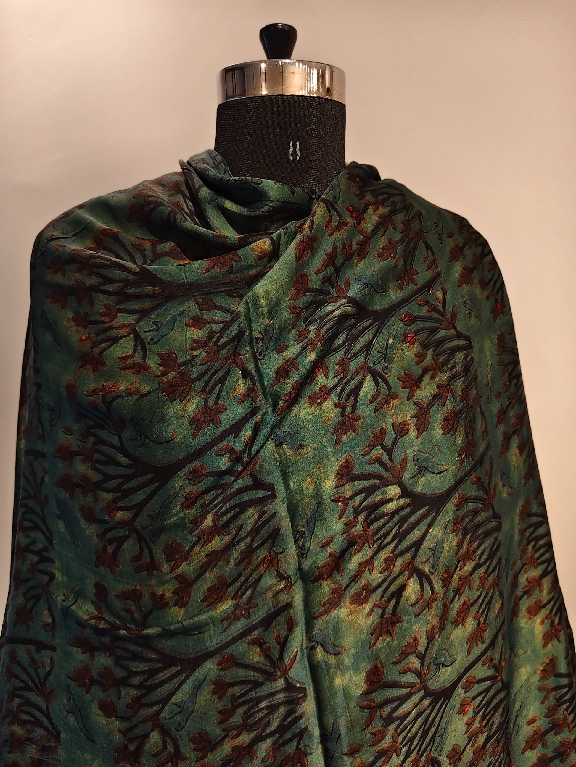 This Dabu-printed modal silk dupatta in black and green embodies natural elegance through contrast. The resist-print technique creates layered depth across the silk’s gentle sheen, offering a blend of craft and contemporary minimalism.