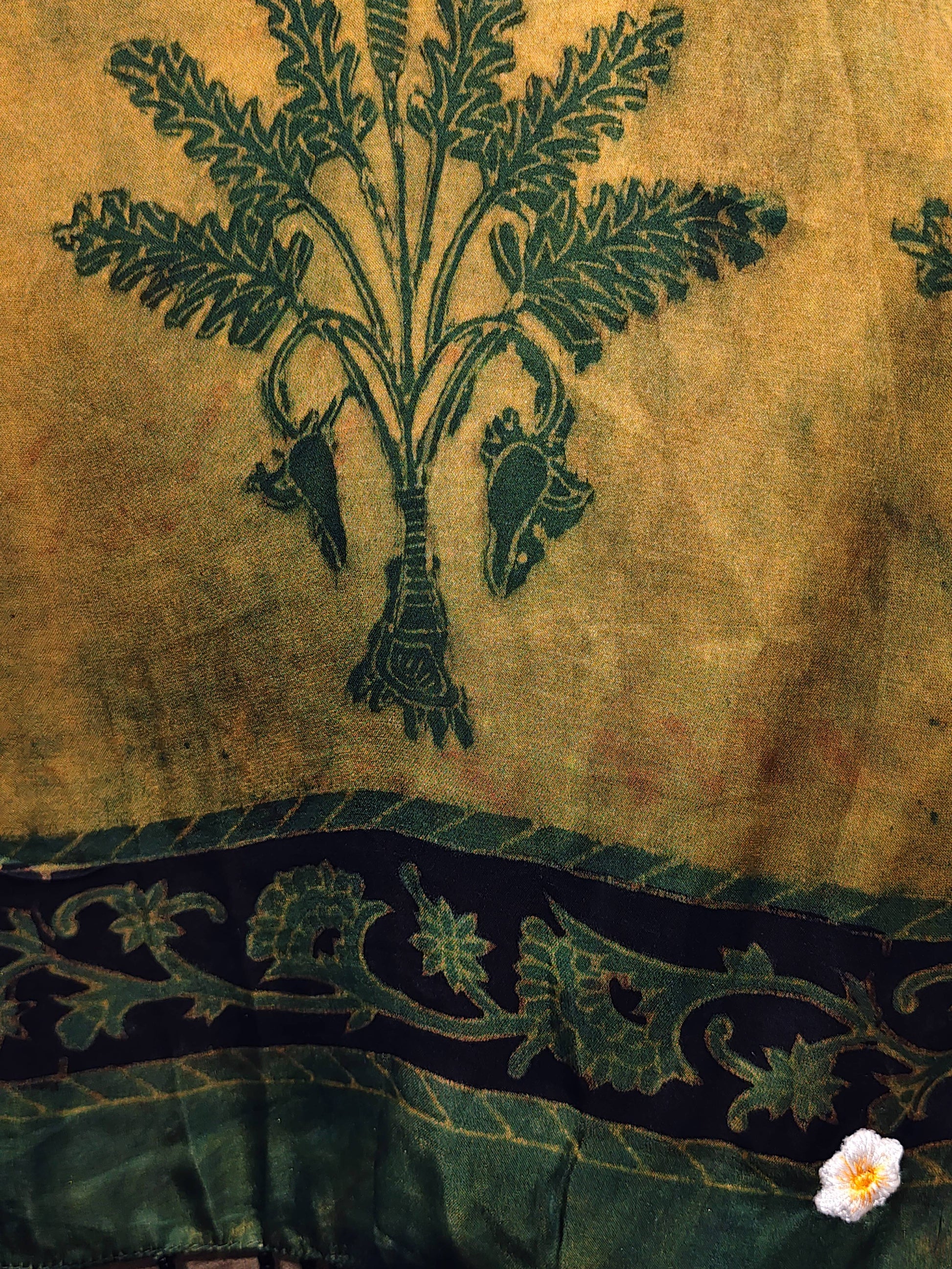 - About Dabu:- Dabu applies a resist paste of clay, gum, and lime through carved blocks. Sawdust absorption stabilises the resist before indigo dyeing. Sequential mud applications generate negative motifs; controlled cracking yields characteristic surface irregularities.