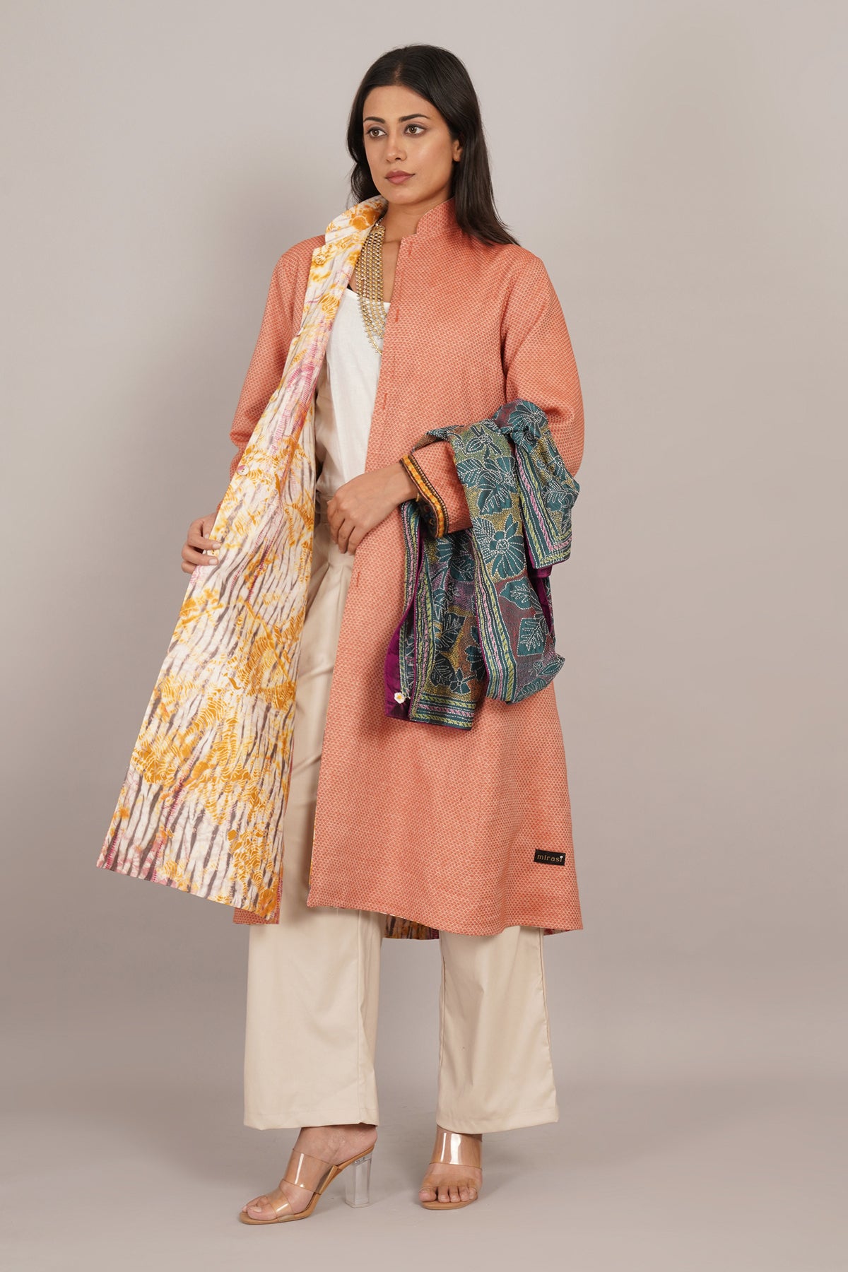 A Shibori jacket that celebrates movement through resist-dyed patterning. Silk and cotton are bound and dyed to create organic surface designs. Each motif emerges through controlled folding and tying techniques. The multi-colour palette enhances the fluid nature of the craft. Lightweight fabric allows ease and comfort. The long silhouette adds graceful structure. Crafted by artisans, it captures the spontaneity of hand dyeing.