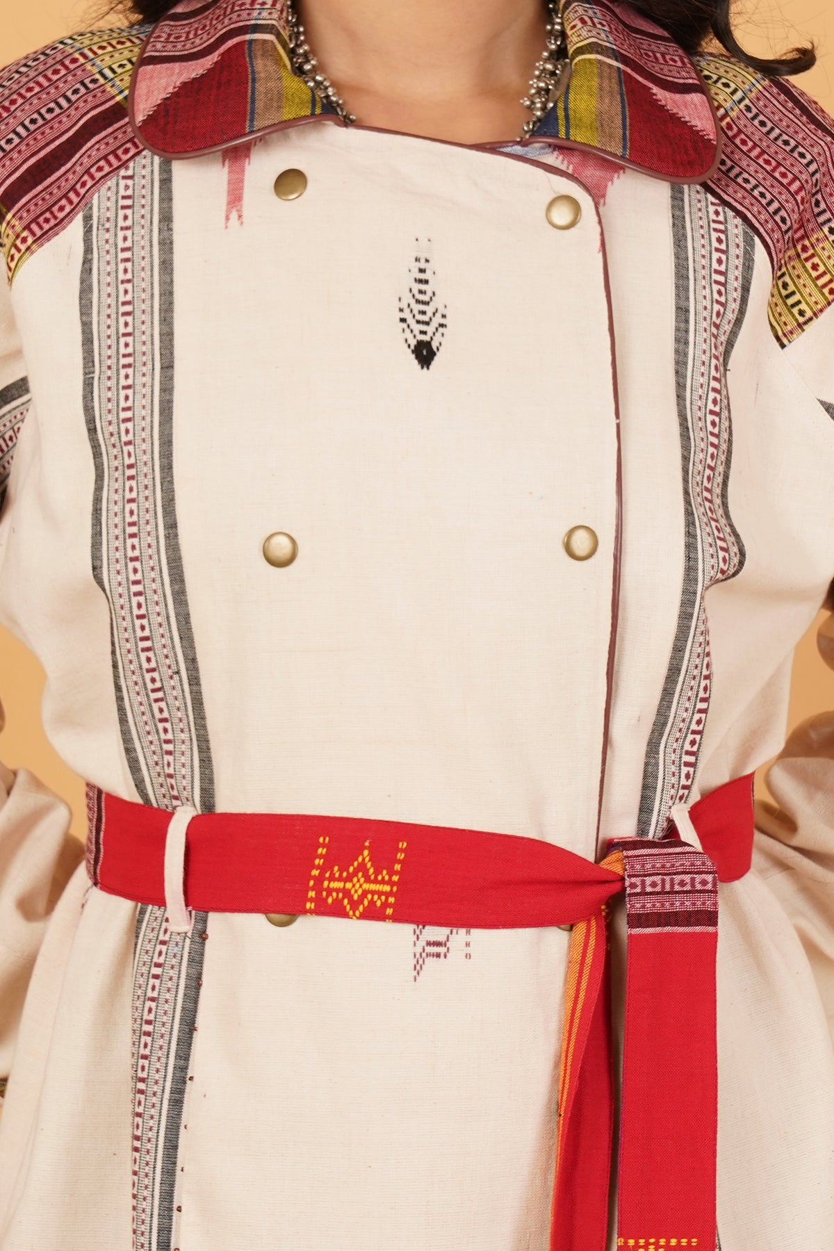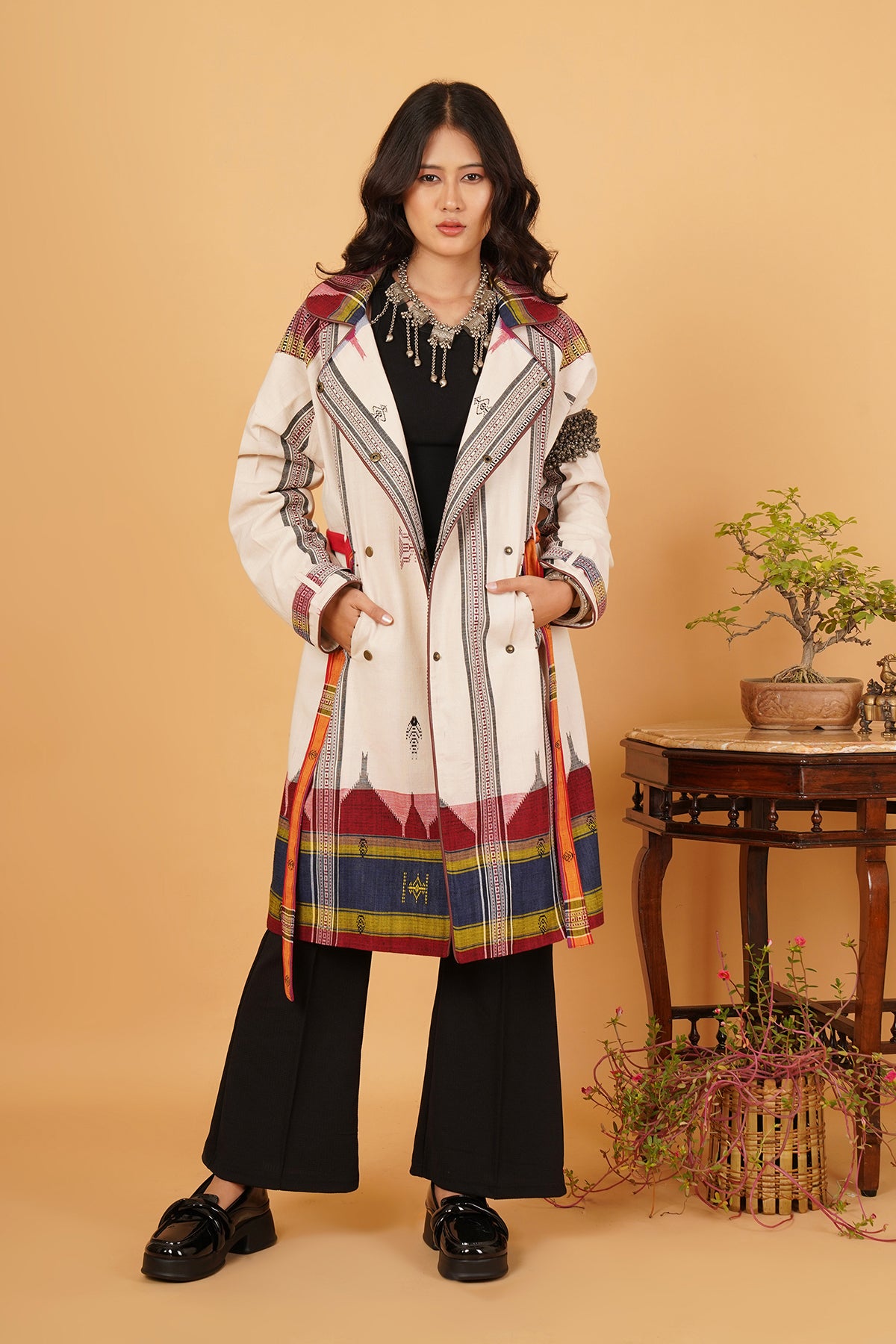 Multicolour Kotpad trenchcoat jacket, long with full sleeves. A vibrant woven tapestry structured into heritage form.