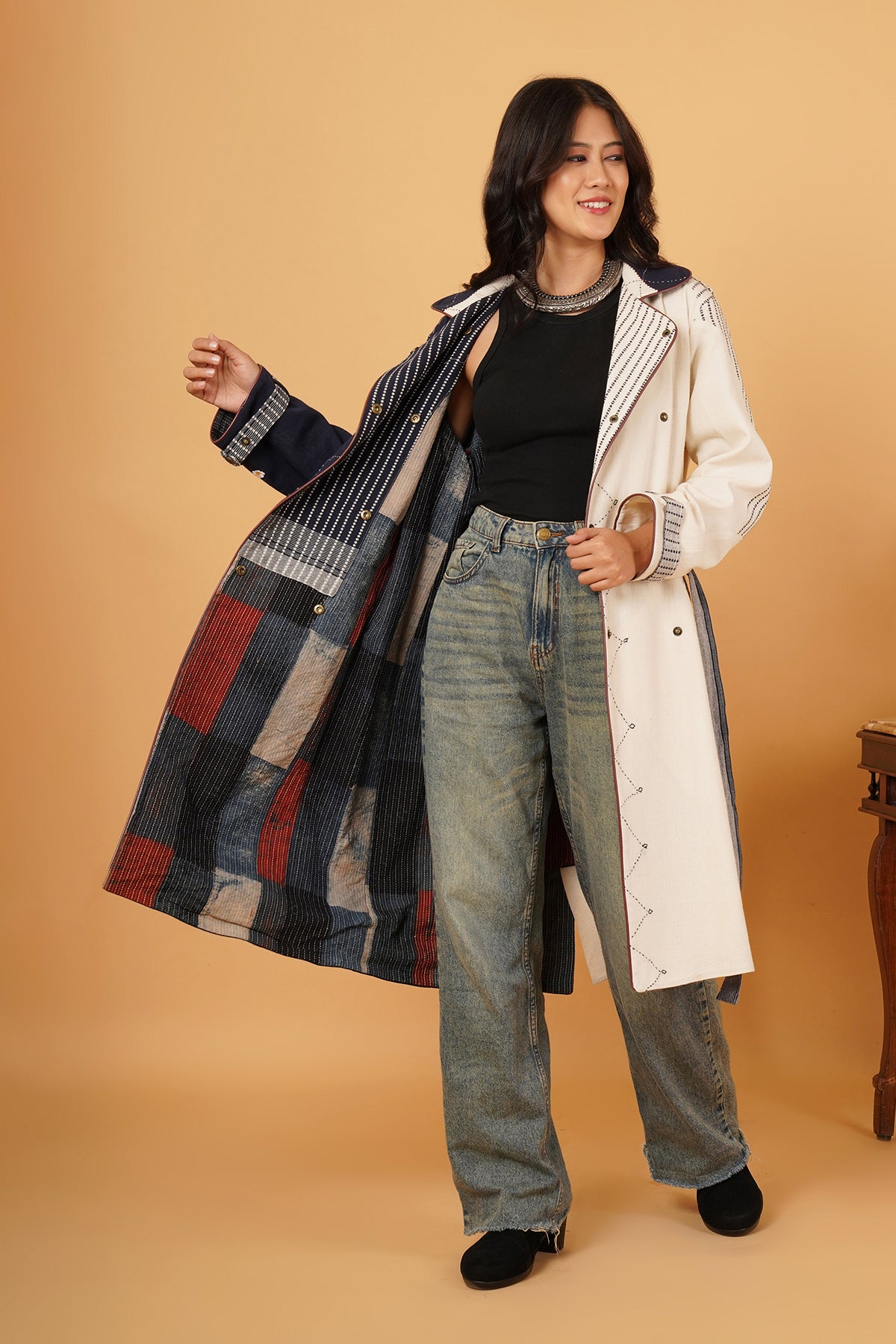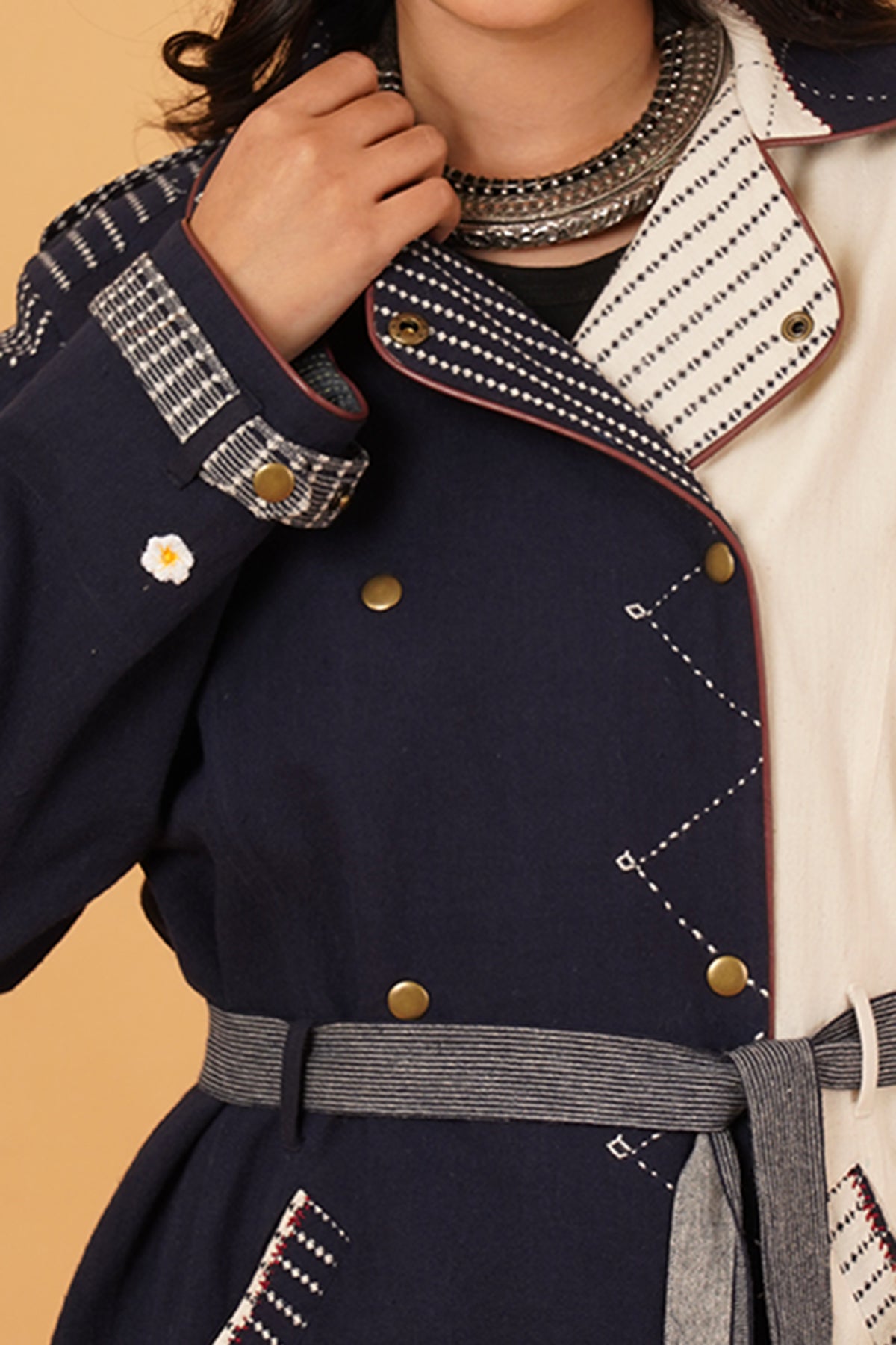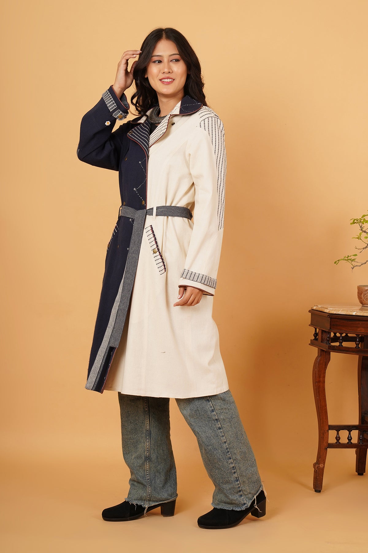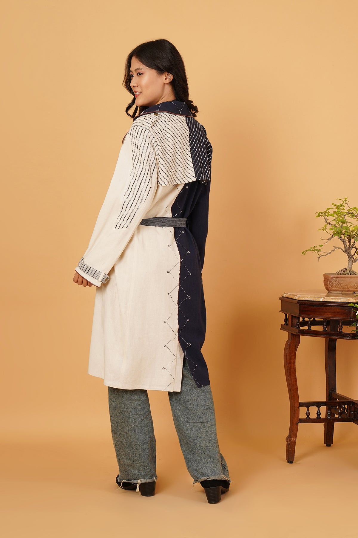 Handwoven Bhujodi in navy and white builds this long trenchcoat. Structured yet soft, a confluence of strength and craft.