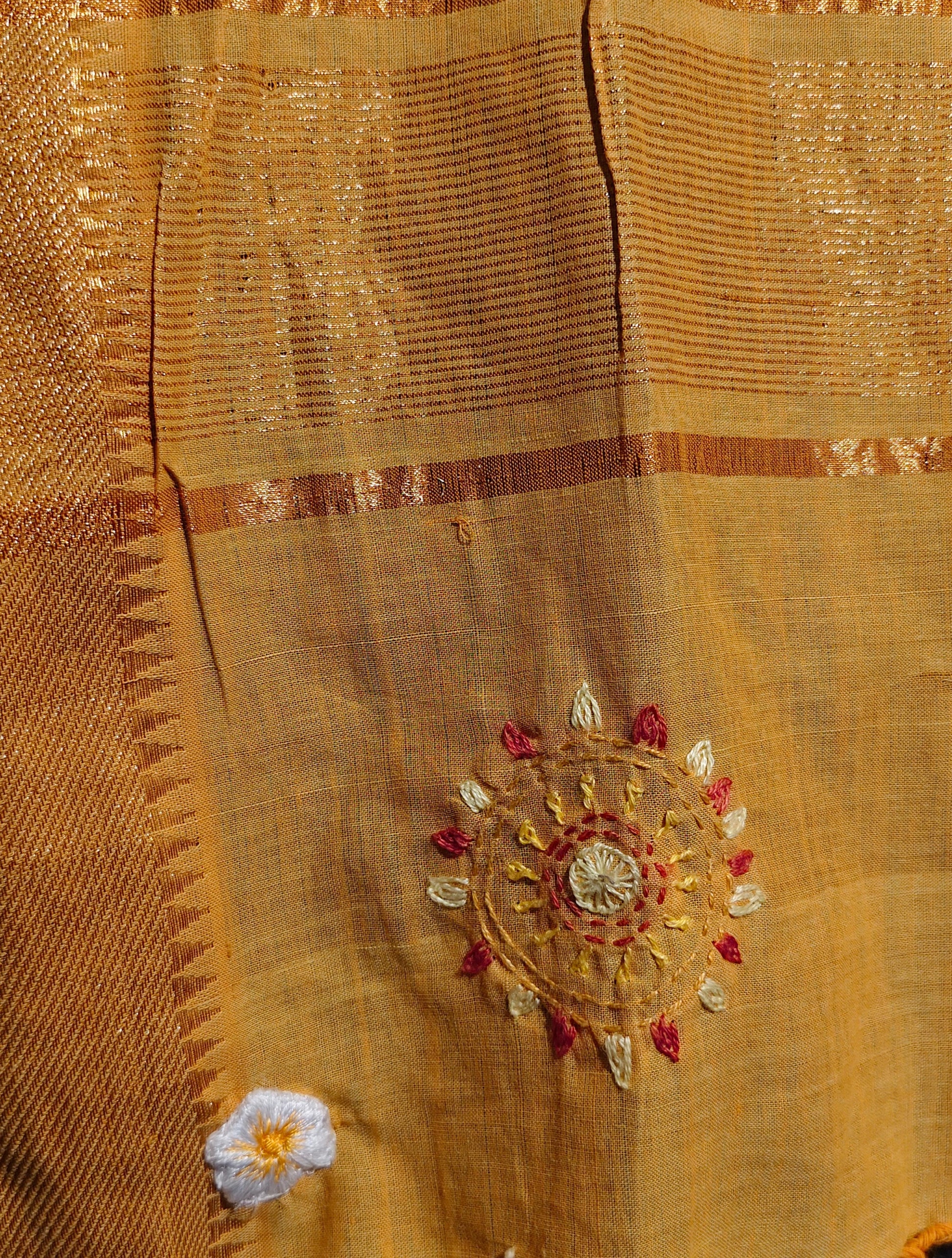 Lambadi embroidery is a traditional craft practiced by the Lambadi community in Tamil Nadu, known for its colorful, intricate designs on cotton and silk fabrics. The style features geometrical patterns, mirrors, and motifs inspired by nature, which tell stories and convey a sense of identity. In rich yellow mustard, this embroidered dupatta brings vibrancy through intricate hand detailing. The layered motifs create texture and warmth, offering a perfect balance of colour, craft and contemporary refinement.