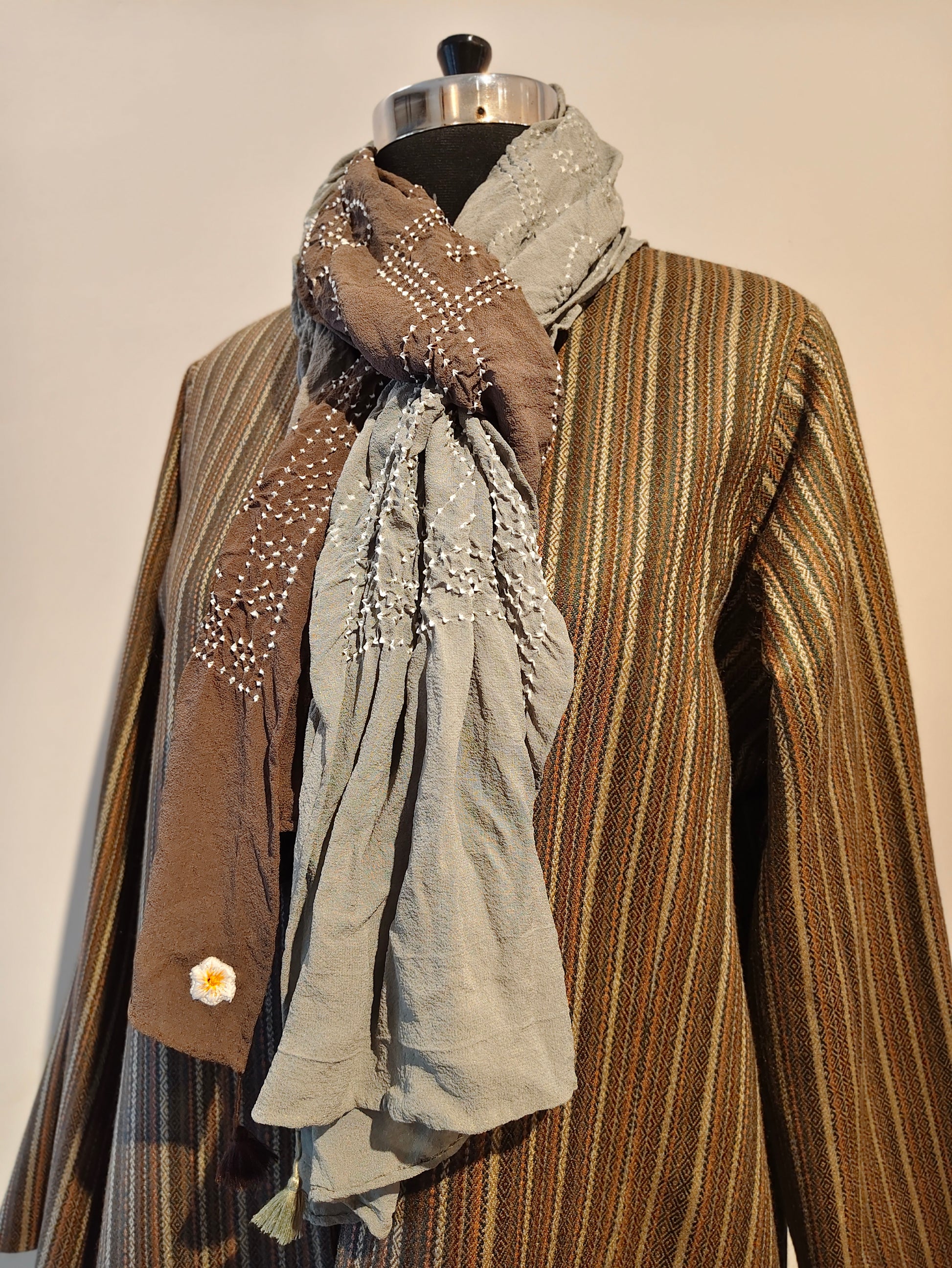 The beauty of this Rai Bandhani stole lies in its precision. Each hand-tied knot resists the dye to reveal delicate geometry, creating a textile that feels timeless and tactile.
