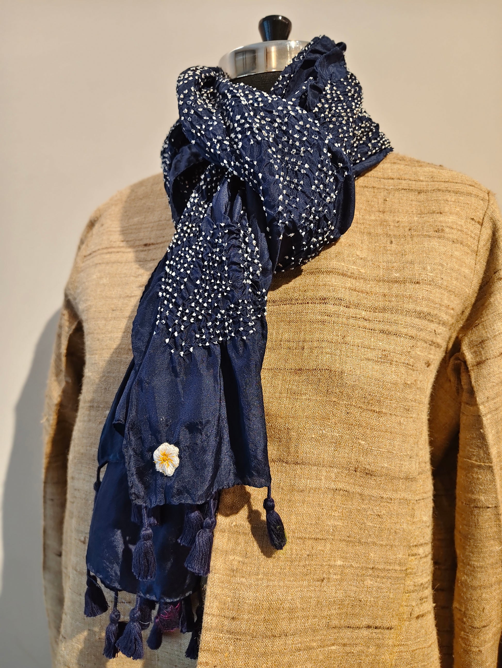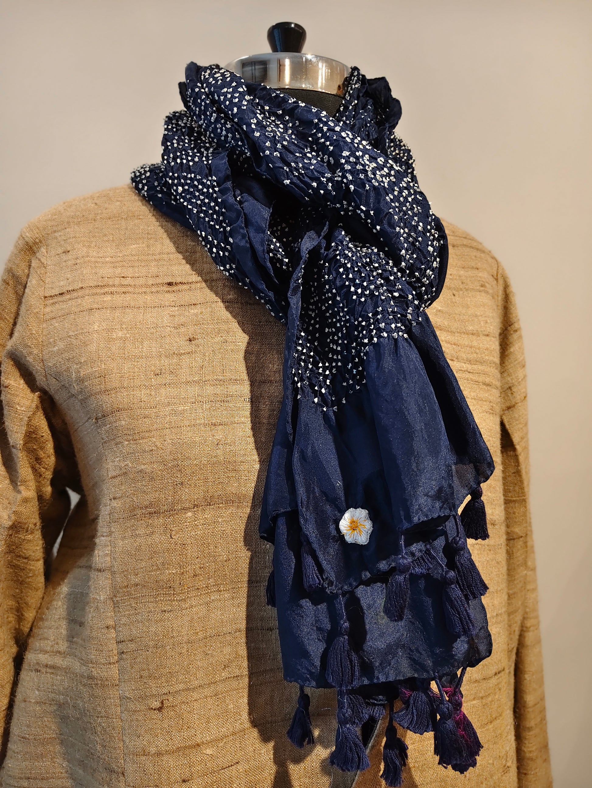 The art of Rai Bandhani transforms this stole into a tapestry of dots and rhythm. The intricate resist patterning lends visual texture while maintaining a graceful, fluid drape.