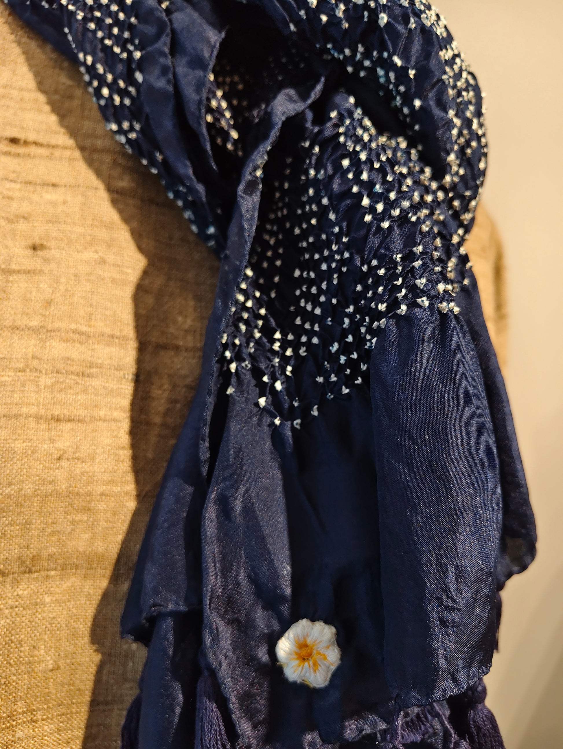 - About Bandhani:- Bandhani’s tie-resist dyeing relies on micro-binding precision. Fabric portions are tied using fine thread tension calibration to resist dye uptake. Sequential dye baths form layered chromatic fields, with residual irregularities defining authentic manual control.