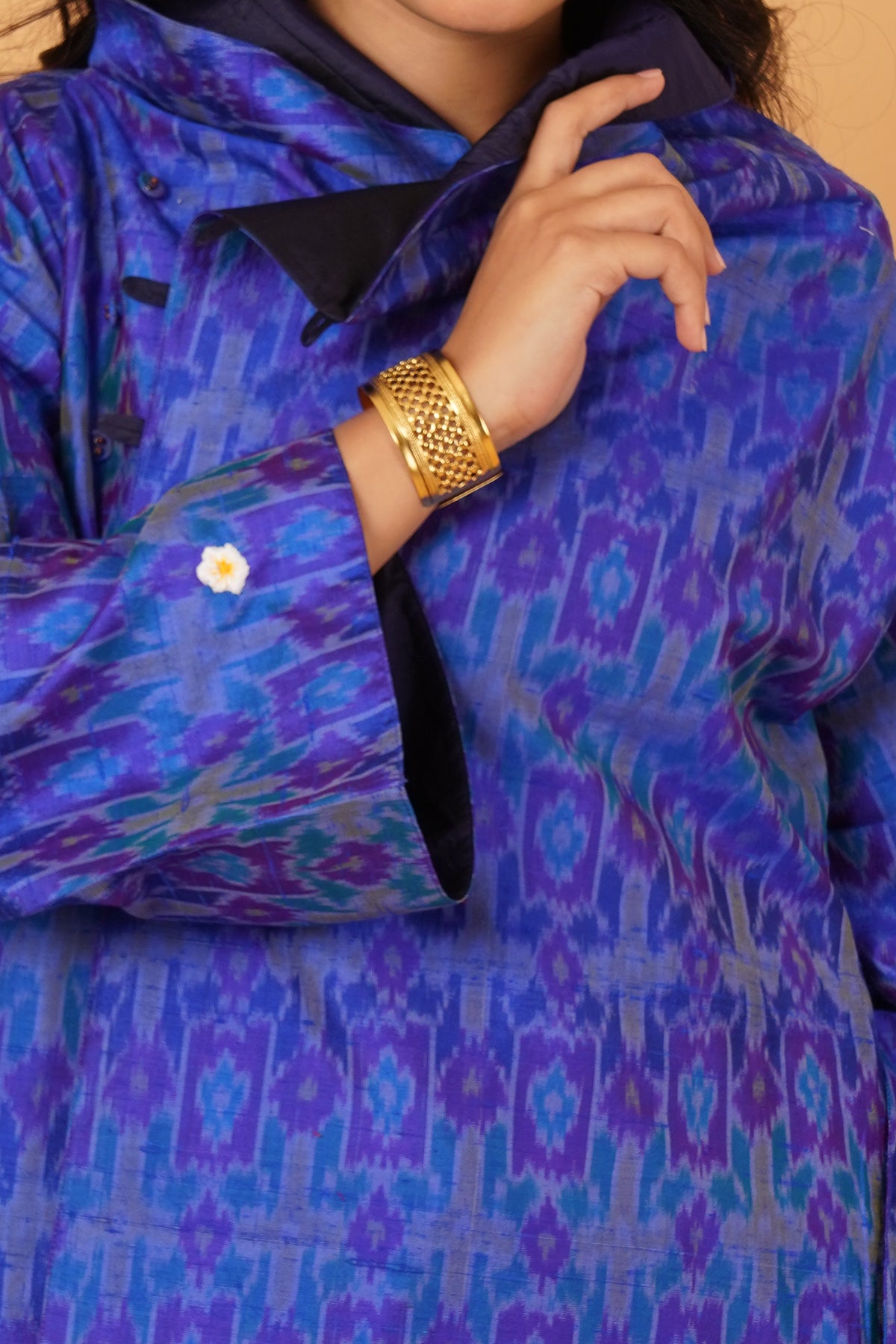 A reversible Ikat silk cape in blue and navy. Long, full sleeves, woven geometry balanced with graceful drape. A bold craft reimagined.