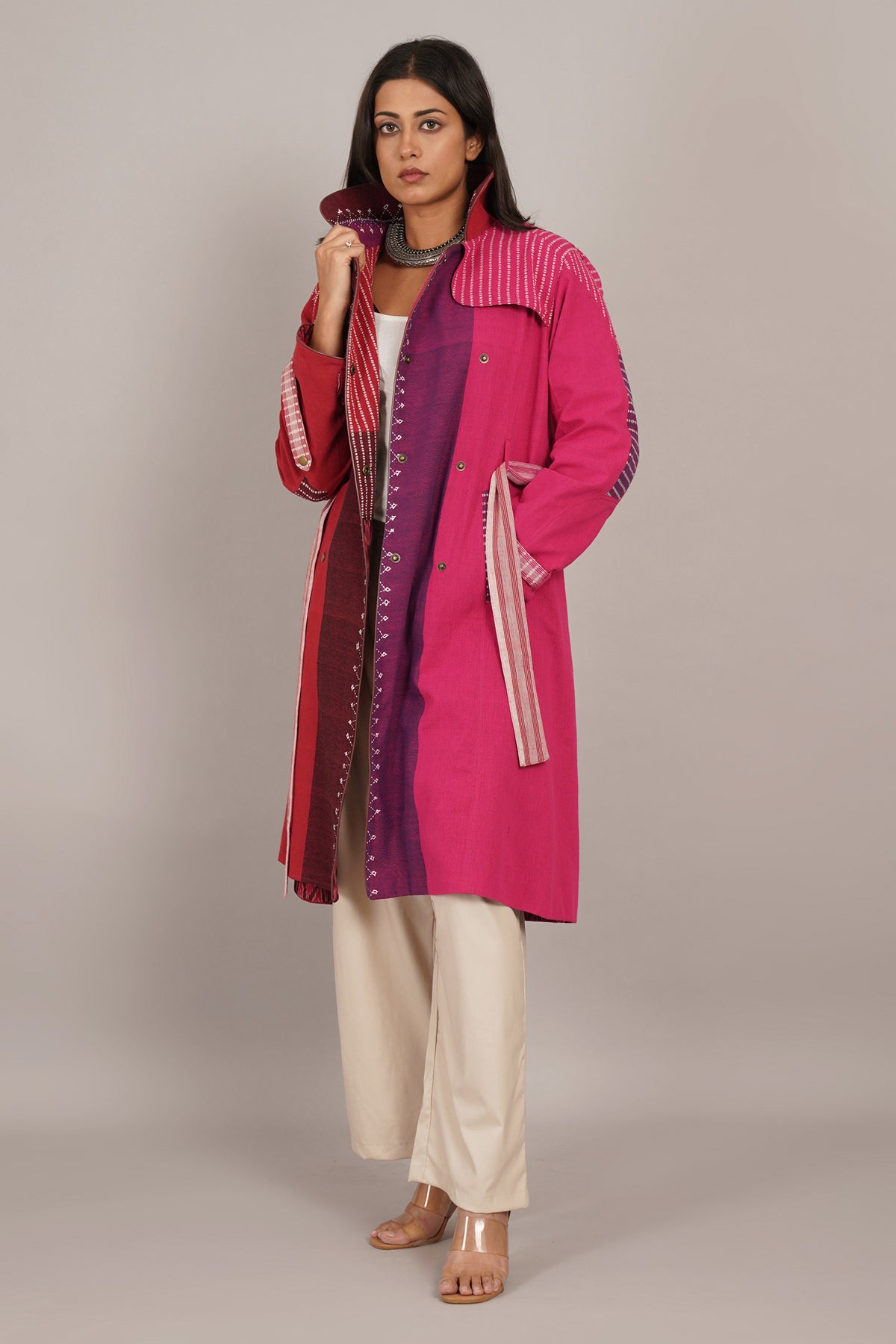 Red Pink Bhujudi Ikat Cotton Trench Jacket