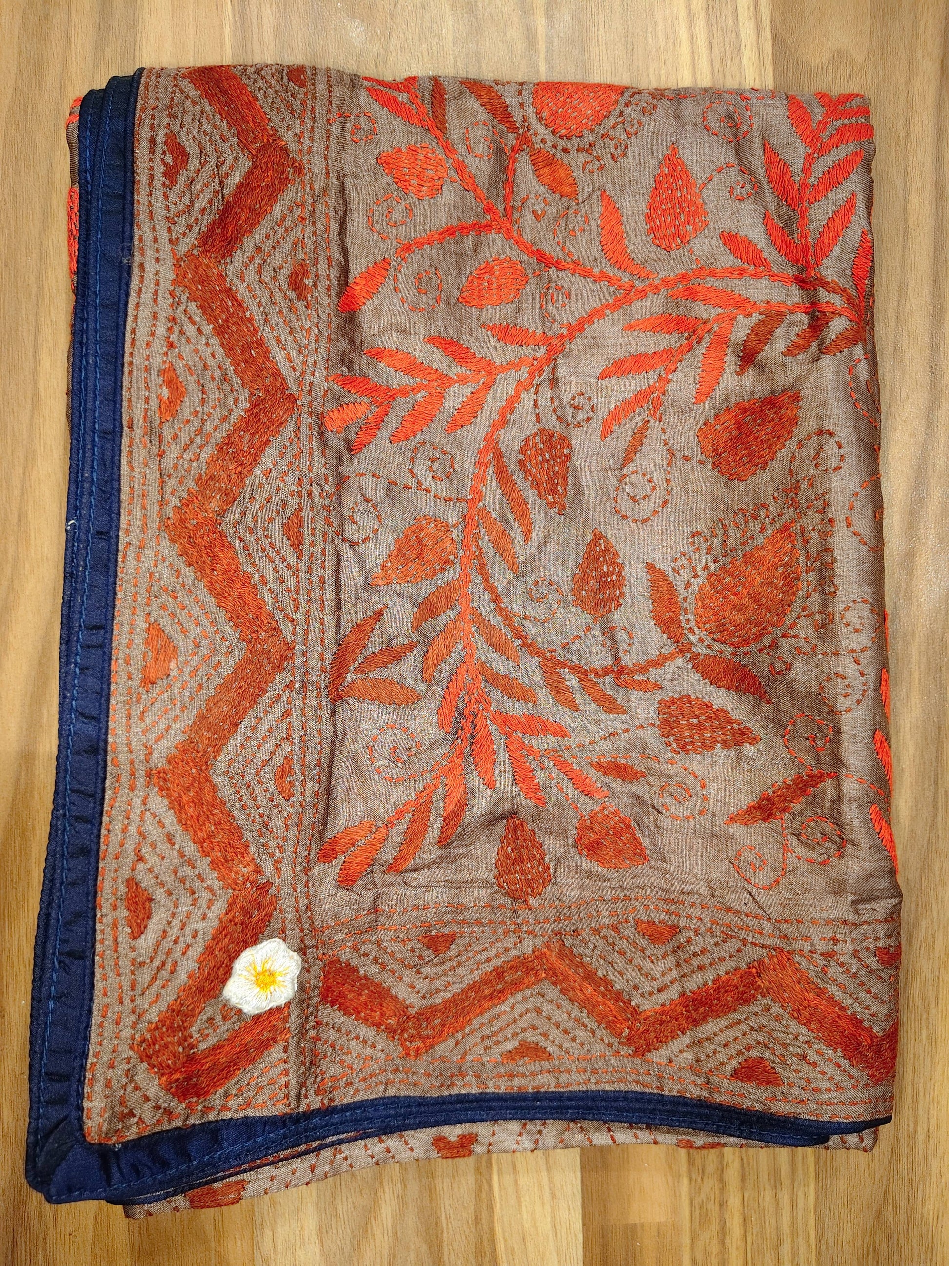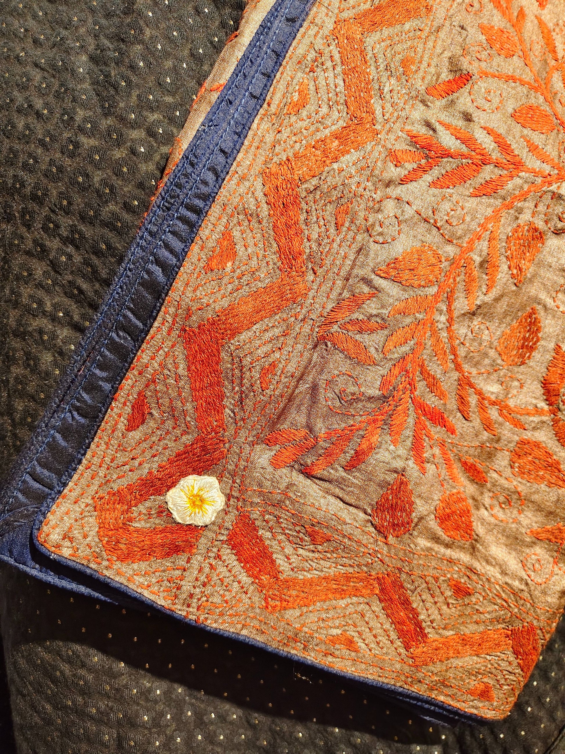 This majestic bronze silk Kantha dupatta carries layers of fine running stitch that ripple across its surface. The embroidery transforms simple fabric into a canvas of motion, designed for those who appreciate craftsmanship in every detail.